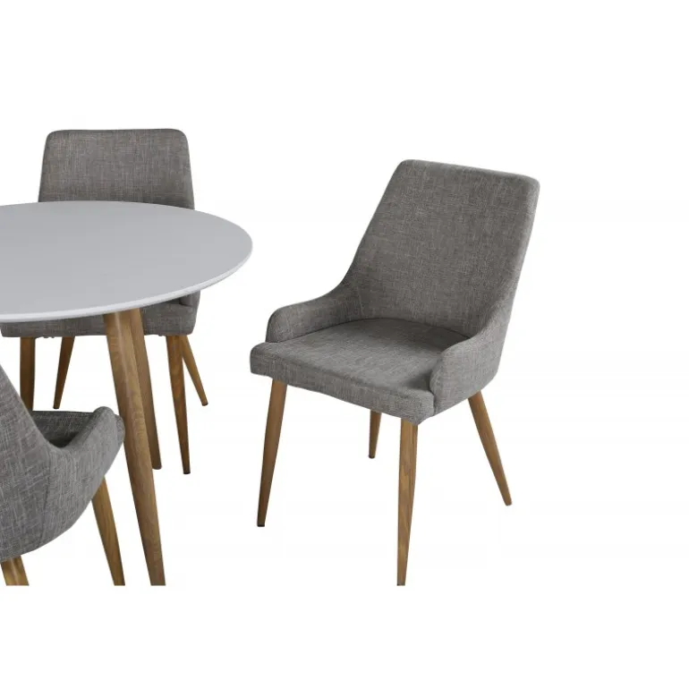- Materialer af høj kvalitet: Bordplade i MDF og stole i polyester linned og stål.