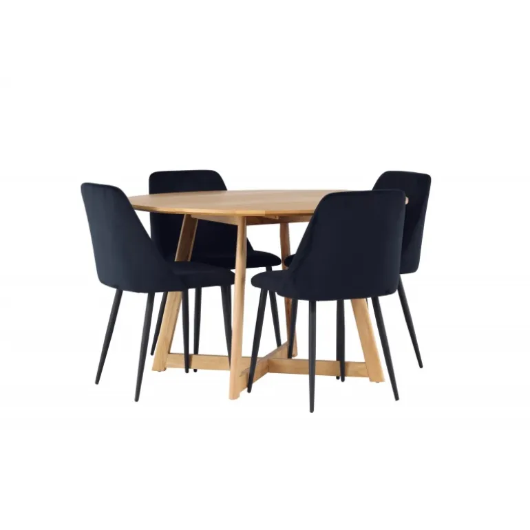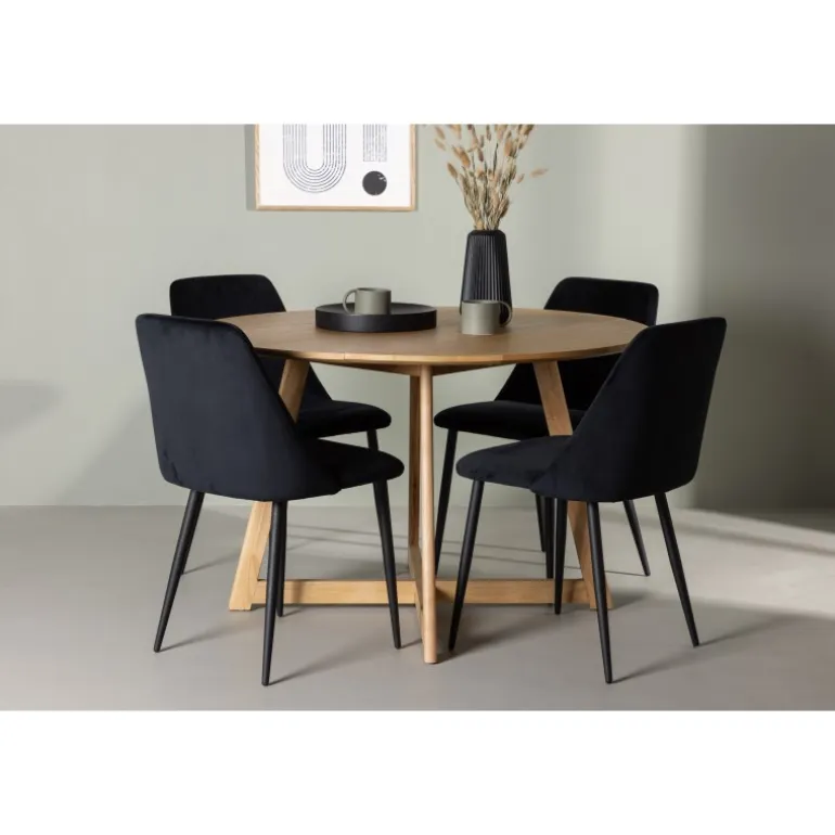Skab en elegant og trendy atmosfære i dit hjem med dette vidunderlige Spisebordssæt i nordisk design! Dette smukke, runde spisebord fra Yakidon-serien i gummitræ har en flot egefarvet finish, der bidrager til et klassisk blikfang i stuen. Med sin runde bordplade og let udadvendte ben mødes stil og funktionalitet perfekt. Sammen med vores sorte spisebordsstole fra Night-serien får du en fantastisk kombination. Disse stole har et eksklusivt fuldt polstret sæde i sort fløjlstof og elegante stoleben, der matcher i sort farve. Stolens design bidrager til en indbydende og modebevidst atmosfære, hvilket gør hvert måltid luksuriøst og hjemligt. Dette er et Spisebordssæt, der er lige så velegnet til hverdag som til fest. Inviter dine kære, lad latteren flyde og nyd øjeblikke, hvor ingen ender på kanten!