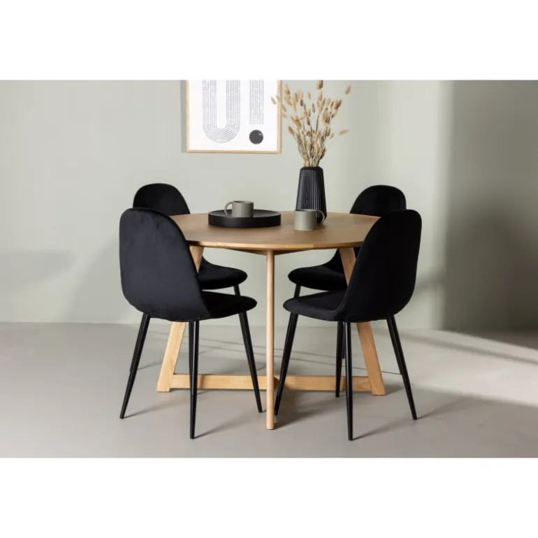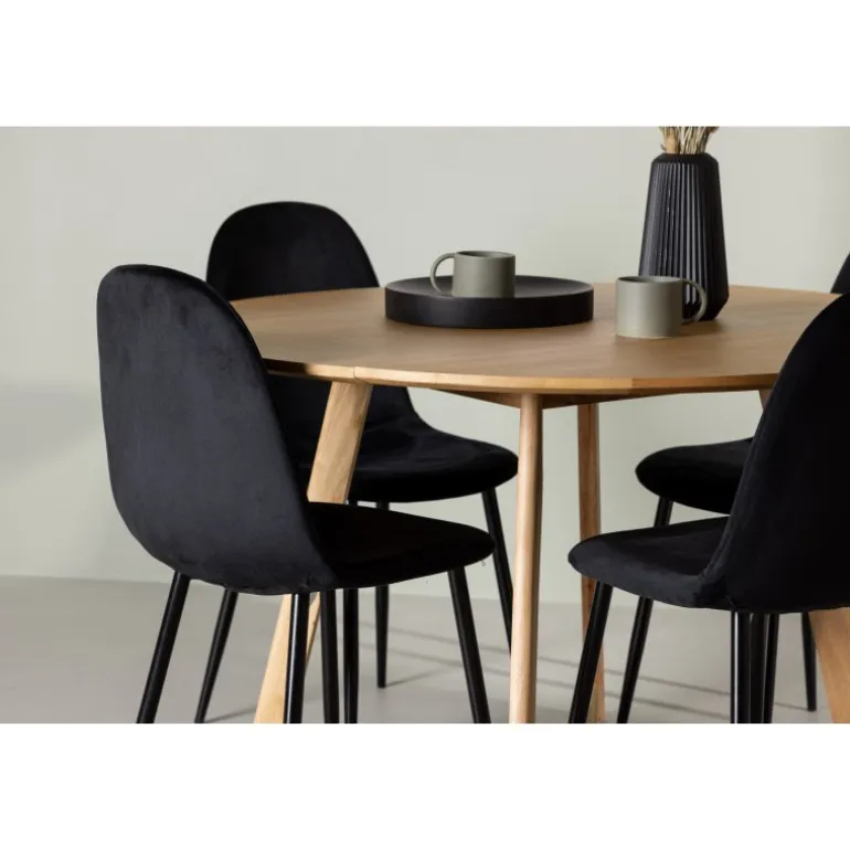 Velkommen hjem til en perfekt kombination af elegance og funktionalitet med dette smarte Spisebordssæt, der står tidens prøve! Vores tilpasselige spisebord Yakidon har to foldbare ender, der tilpasser sig dine skiftende behov. Uanset om du har brug for ekstra plads til en festlig lejlighed eller foretrækker en mere intim middag for to, kan du nemt justere bordets størrelse efter dine præferencer. De let udadgående ben, der konvergerer i et kryds på gulvet, giver bordet et distinkt og stilfuldt udseende. Fremstillet helt af egetræs-lignende MDF og gummitræ, er det nemt at holde rent med hjælp fra vores plejeinstruktioner. Her er det parret med stole fra Polar-serien. De fuldt polstrede stole, med ben i sort pulverlakeret metal og den vidunderligt afrundede ryglæn og sæde i sort velourstof med blød polstring, skaber en perfekt balance mellem komfort og design. Stop med at gå på kompromis og lad dette Spisebordssæt være hjertet i dit hjem. Skab mindeværdige øjeblikke med din familie og venner i stil, komfort og elegance. Det er tid til at løfte dine middagsselskaber til et nyt niveau!