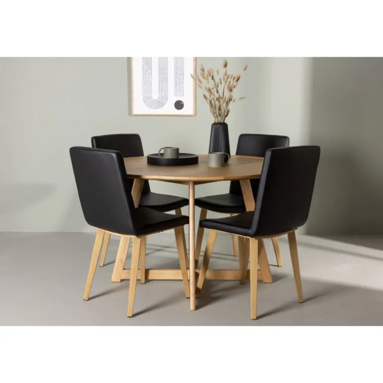 Skab det perfekte sted til hyggelige middage, hvor ingen risikerer at ende på kanten! Vores runde spisebord Yakidon i smukt gummitræ har en klassisk egetræsfarvet finish, der vil give dit hjem et nostalgisk look. Med sin runde bordplade og let udadvendte ben skaber Yakidon en balanceret og harmonisk atmosfære i rummet. Her i perfekt kombination med vores pragtfulde spisestuestole fra Today-serien. Disse elegante stole har sorte PU-sæder, der giver den perfekte balance mellem komfort og stil. Stolebenene er lavet af træ og komplementerer spisebordets nordiske design perfekt. Med deres stilfulde og enkle design vil disse stole tilføje et strejf af luksus til ethvert måltid. Giv dit hjem det perfekte spiseområde med dette Spisebordssæt. Skab minder og lad samtaler flyde med dine kære i en hjemlig atmosfære af elegance og stil!
