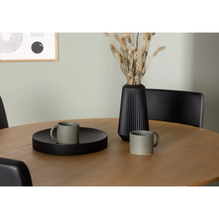 - Rundt spisebord i egetræsfarvet gummitræ: Skaber en balanceret og harmonisk atmosfære.