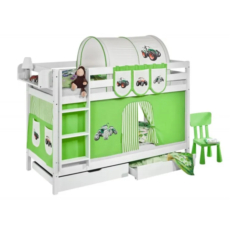 Inkl.: Forhæng med Grøn gravko-tema, 2 bundskuffer samt madrasser.