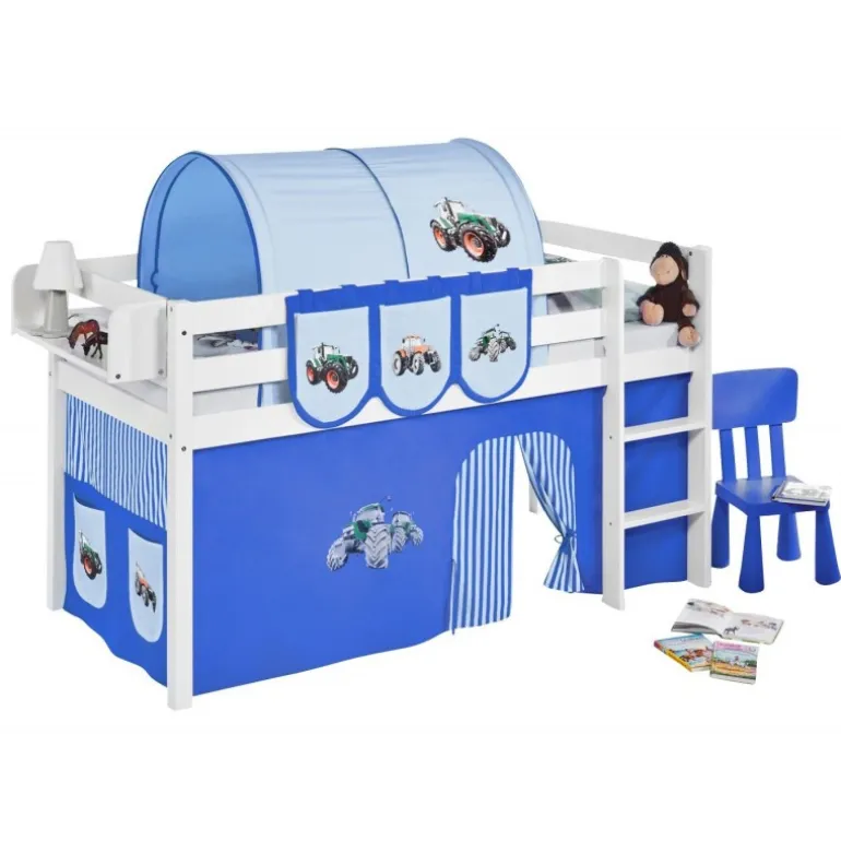 Halvhøj seng fra serien Bumle inklusiv forhæng med blåt gravko tema samt lamelbund og madras. Sengen er udstyret med flytbar stige med god brede trin, som kan monteres i enten højre eller venstre side. Bumle er serien til dig som går op i kvalitet og tidløst design men ikke vil betale for dyre mærkevarer.
