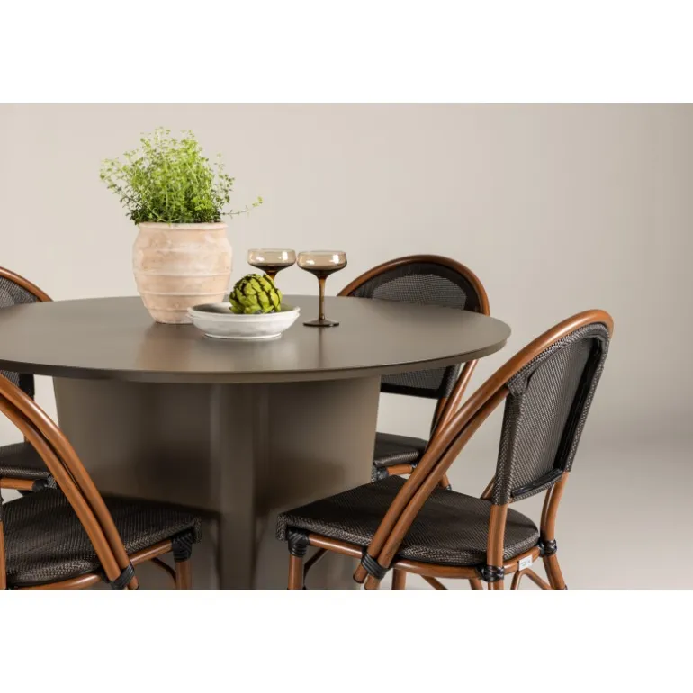 Oplev den perfekte spiseplads til samvær med venner og familie med vores nye Loungesæt – Havemøbelsæt – Guarda og Santa Fe. Med en jordnær atmosfære og et iøjnefaldende design, hæver dette ensemble dit udendørsmiljø til nye højder. Guarda-stolene er fremstillet med fokus på både stil og komfort. Deres sorte sæder i teslin-materiale kombinerer elegance med komfort, mens den brune aluminiumsramme giver stabilitet og et naturligt udseende. Disse stole er designet til at være både komfortable og trendy, perfekte til lange udendørs sammenkomster. Santa Fe-bordet er midtpunktet i dette Loungesæt – Havemøbelsæt med en generøs diameter på 120 cm. Bordet er lavet af brunt aluminiumsmateriale, hvilket giver et slankt og moderne design, der passer perfekt til nutidens udendørsmiljøer. Dette Loungesæt – Havemøbelsæt er ideelt til udendørs brug og skaber en atmosfære af kammeratskab og venskab med sit jordnære design. Med fire inkluderede stole er dette sæt komplet til at skabe mindeværdige øjeblikke og nyde afslappede udendørs måltider.