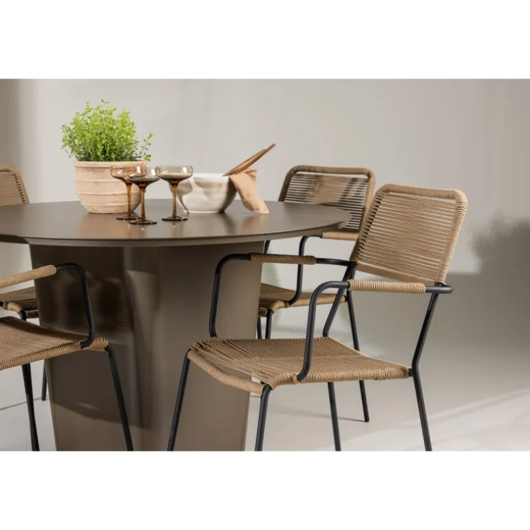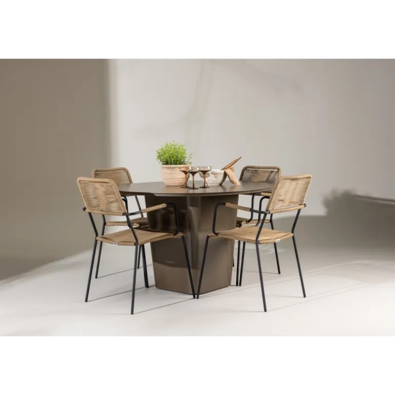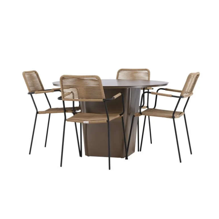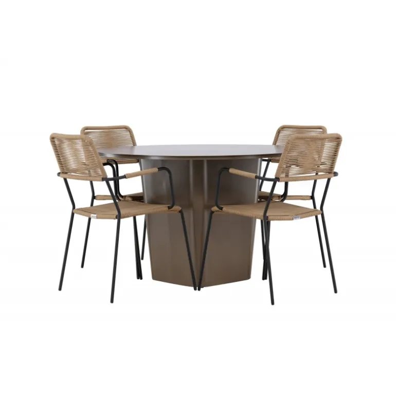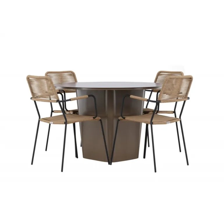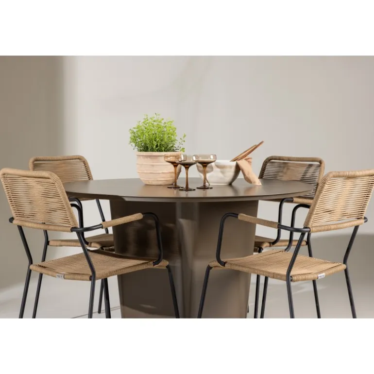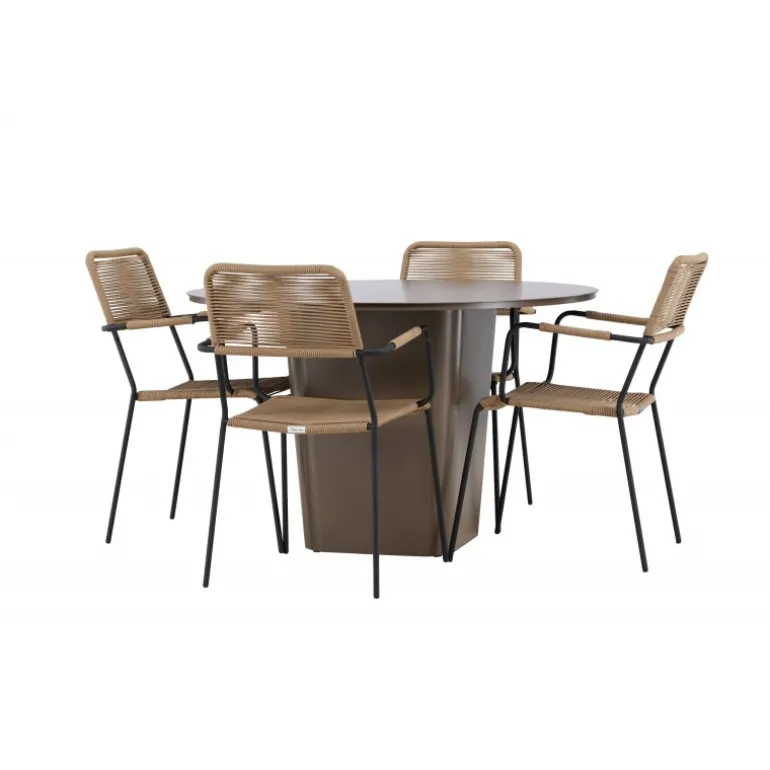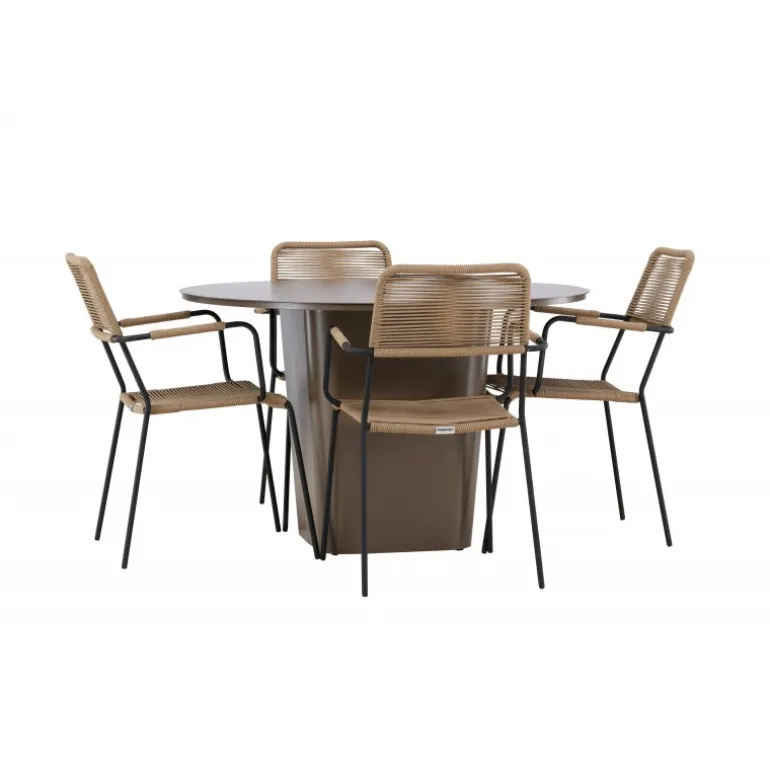 Oplev den perfekte kombination af stil og komfort med vores Loungesæt – Havemøbelsæt – Lindos og Santa Fe. Med en fremragende design og en varm atmosfære, vil dette sæt løfte dit udendørsmiljø til det næste niveau. Lindos-stolene er skabt med et elegant og minimalistisk design. Deres sæder er vævet i brunt rebmateriale, hvilket ikke kun giver en varm atmosfære, men også en komfortabel siddeoplevelse. Stolens ben er lavet af sort stål, som tilbyder stabilitet og et moderne touch til det samlede udseende. Santa Fe-bordet fungerer som midtpunktet i dette Loungesæt – Havemøbelsæt, fremstillet af robust brunt aluminiumsmateriale. Med en imponerende diameter på 120 cm, giver det masser af plads til familiemiddage eller afslappede sammenkomster med venner udendørs. Dette Loungesæt – Havemøbelsæt er ideelt til udendørs brug og skaber en minimalistisk atmosfære med sit elegante design. Med fire inkluderede stole er dette sæt komplet og giver en indbydende og stilfuld følelse til dit udendørsmiljø.