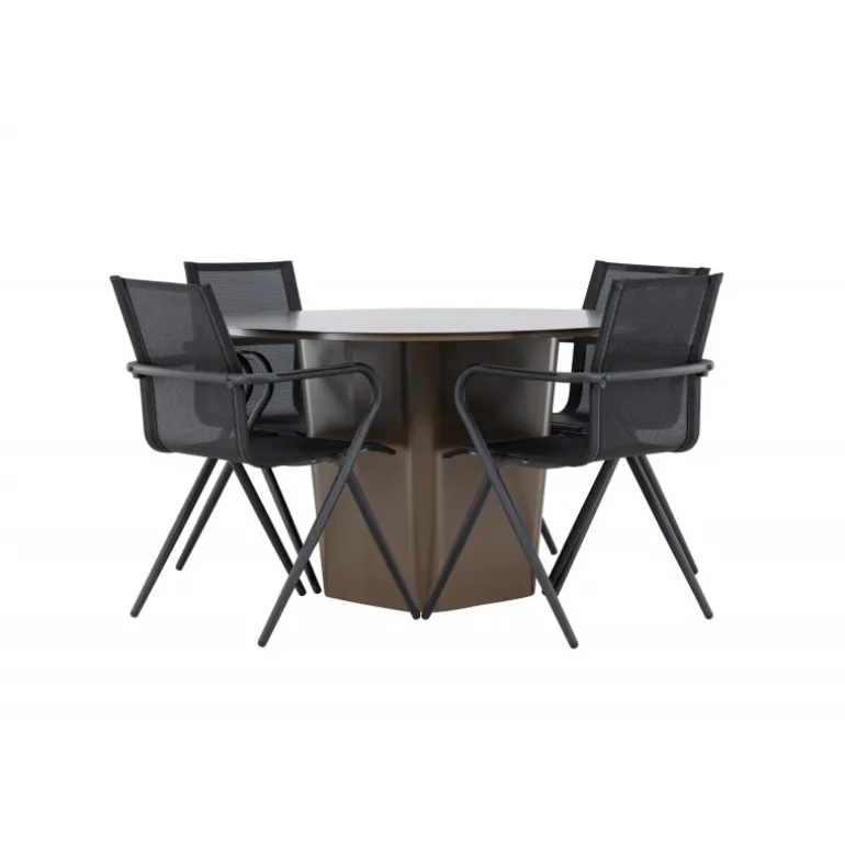 Opdag det perfekte Loungesæt – Havemøbelsæt til dit udendørsområde med vores elegante ensemble bestående af Santa-bordet og Alina-stolene. Santa-bordet er centrum for din udendørs spiseoplevelse med en generøs diameter på 120 centimeter. Lavet af aluminium i en smuk brun nuance, udstråler dette bord en følelse af klasse, der passer perfekt til dit udendørsmiljø. Alina-stolene er den ultimative komplement til Santa-bordet. Lavet af aluminium i en elegant sort farve, tilbyder disse stole både stil og komfort til din udendørs afslapning. Med fire inkluderede stole er dette Loungesæt – Havemøbelsæt ideelt til at samle familie og venner til mindeværdige øjeblikke under åben himmel. Giv dit udendørsområde den perfekte atmosfære til spisning og afslapning med vores Santa og Alina Loungesæt – Havemøbelsæt.
