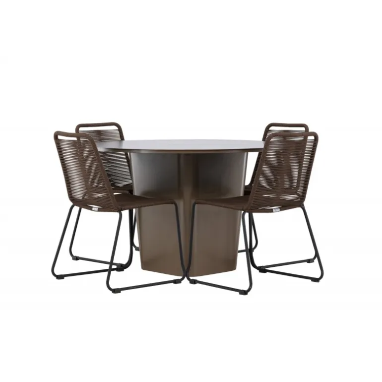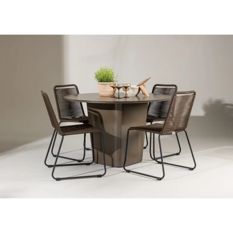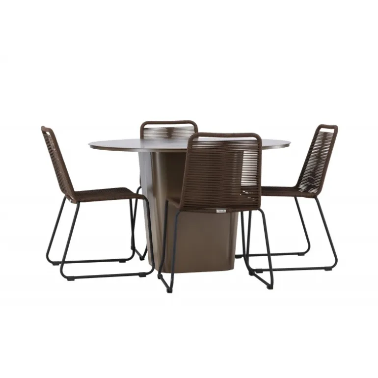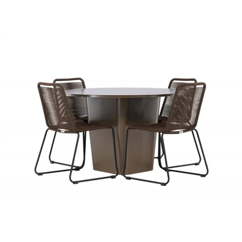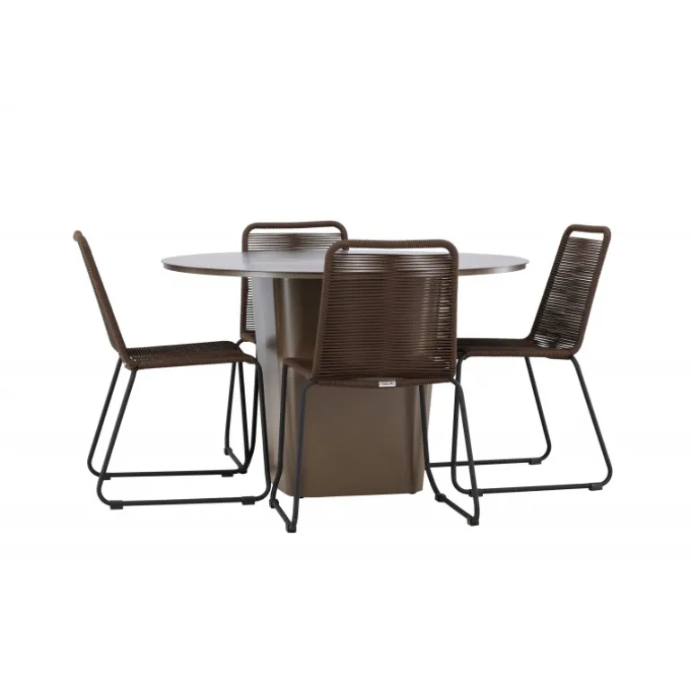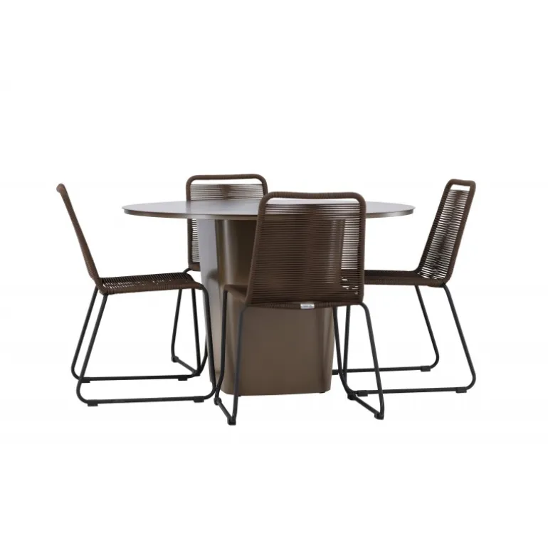 Oplev den perfekte blanding af stil og funktionalitet med vores nye Loungesæt – Havemøbelsæt – Lindos og Santa Fe. Denne elegant udformede ensemble er designet til at forbedre dine udendørsområder med et moderne design. Lindos stolene tilbyder en harmonisk fusion af komfort og æstetik. Deres sæder er fremstillet af robust brunt polypropylenmateriale, hvilket giver en naturlig, jordnær følelse. De sorte stålben giver en solid base, mens de bidrager til en moderne, minimalistisk stil. Santa Fe bordet fungerer som midtpunktet i dette Loungesæt – Havemøbelsæt med sit imponerende design og praktiske funktioner. Fremstillet af brunt aluminiumsmateriale kombinerer det holdbarhed med letvægtskonstruktion og nem vedligeholdelse. Med en diameter på 120 cm tilbyder det rigelig plads til familiemåltider eller afslappede sammenkomster med venner udendørs. Dette Loungesæt – Havemøbelsæt er ikke kun en praktisk investering for dit udendørsmiljø, men også en æstetisk tiltalende tilføjelse, der skaber en atmosfære af sofistikeret enkelhed. Med fire Lindos stole inkluderet er dette sæt ideelt til både små og større udendørsområder.