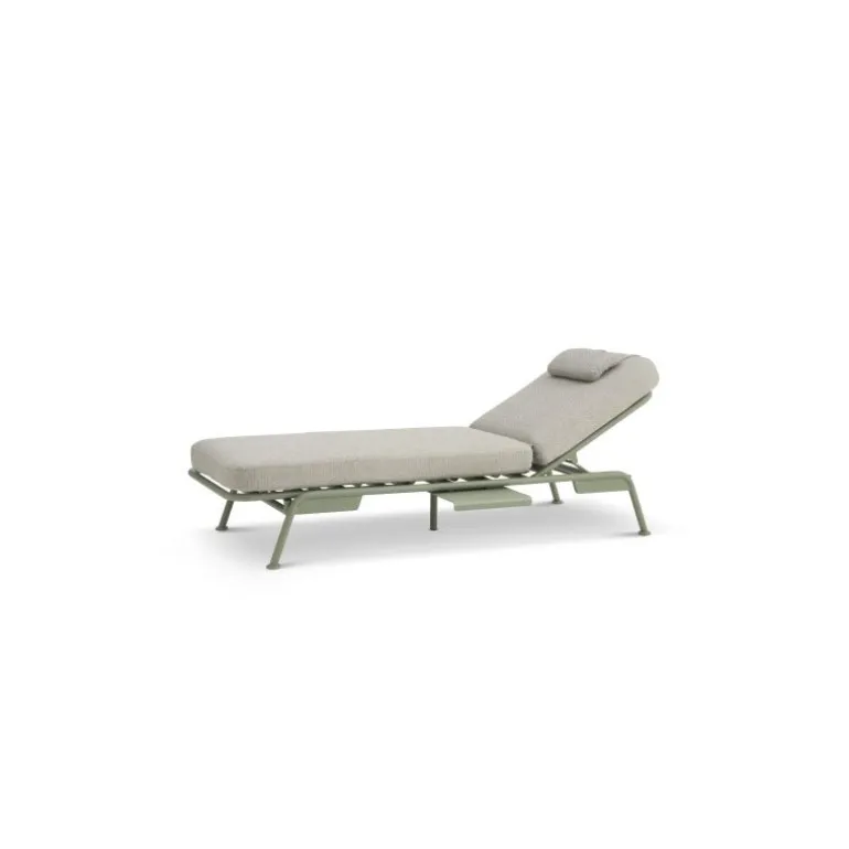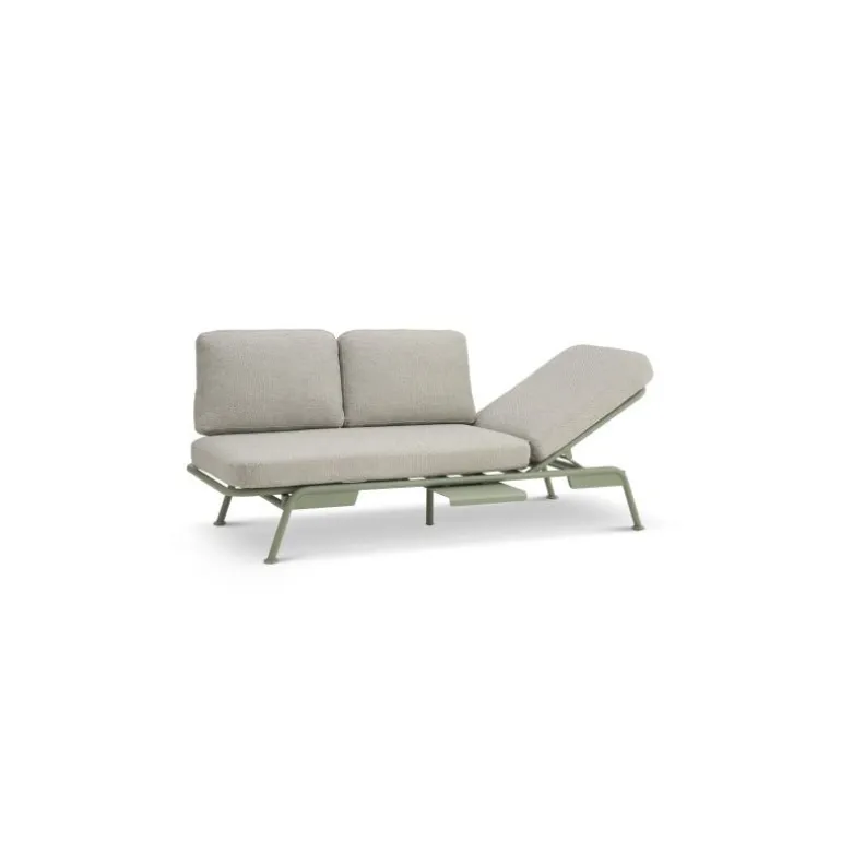 Du har flere anvendelsesmuligheder med den. Den kan stå som en tre pers sofa, du kan hæve det ene siddestykke, så det bliver til en daybed og du kan ombygge den ved at skubbe ryg-stellet ind under, så det bliver til en solseng. Derudover er der en hylde / bordplade som kan hives ud og vupti, der kan glas, telefon og briller ligge på.