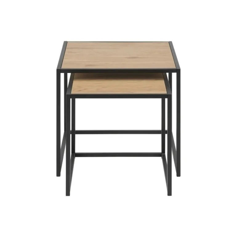 Cristal er to indskudsborde med et lækkert minimalistisk design. Bordene er udført med en smal bordplade i eg og er stabiliseret af en slank sort metalramme, som understøtter den lette og luftige stil. Ideelt til stuen i det moderne hjem.