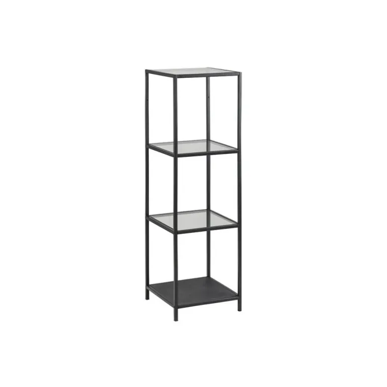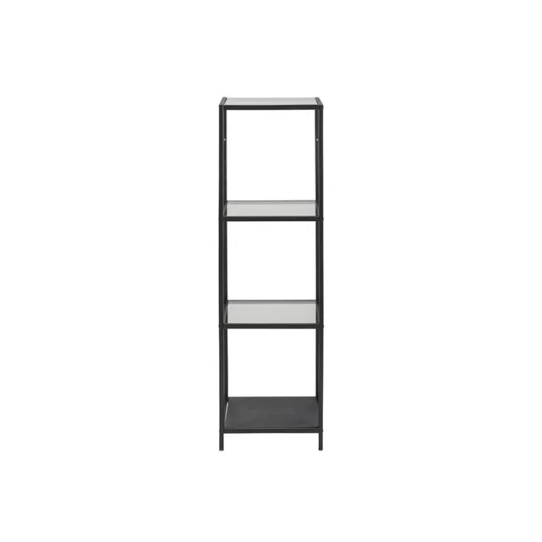 Elegant reol med glashylder og slankt sortmalet metalstel i lækker minimalistisk stil. En moderne og funktionel reol med mange anvendelsesmuligheder. Udover stuen kan reolen med fordel også benyttes i badeværelset eller køkkenet.