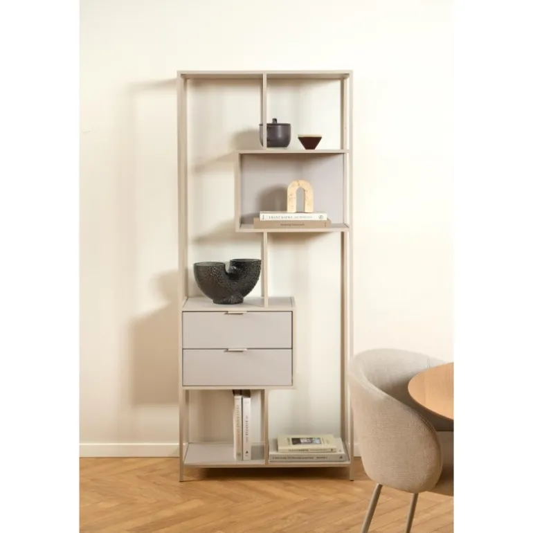 Reolen er bygget på en robust ramme i grå ru pulverlakeret stål og byder på 4 åbne hylder og 2 skuffer i ru grå melamin. Den asymmetriske opbygning og vendbare bagpanel giver dig mulighed for at tilpasse udtrykket til dit rum.