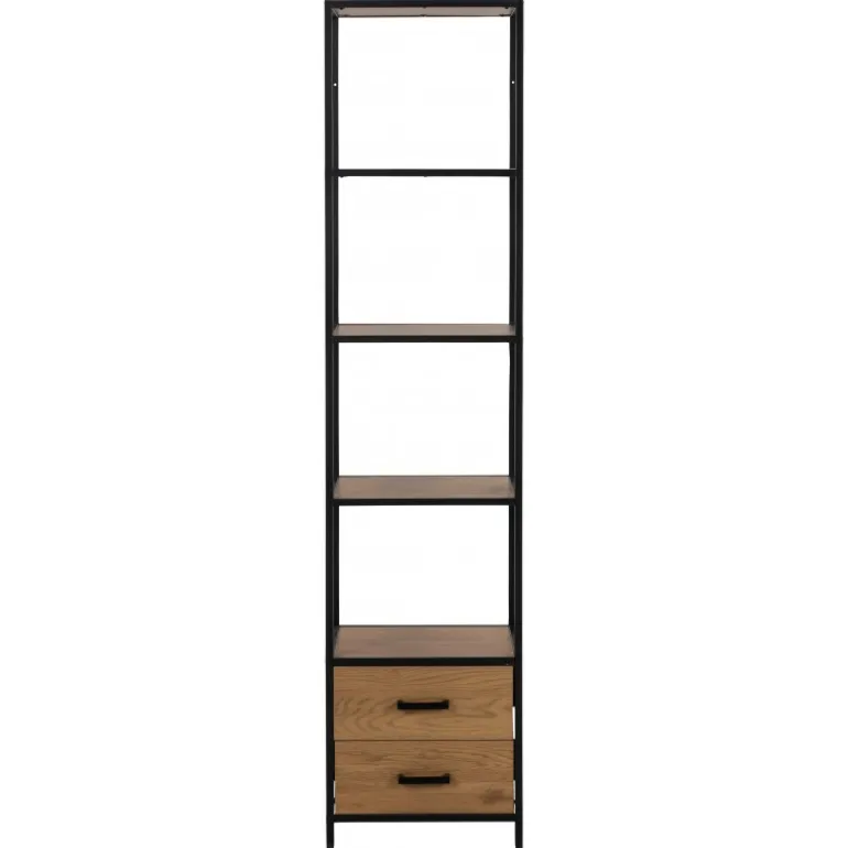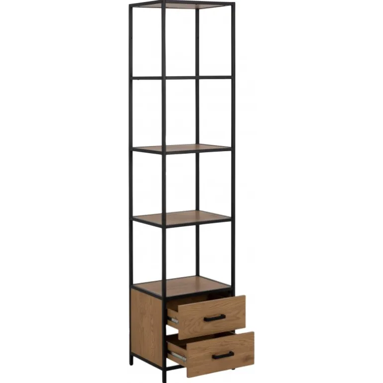 Seaford bogreol hylder 3 stk, skuffer 2 stk papir vild eg, stel metal pulverlakeret ru, mat sort L:42 B:35 H:185 cm