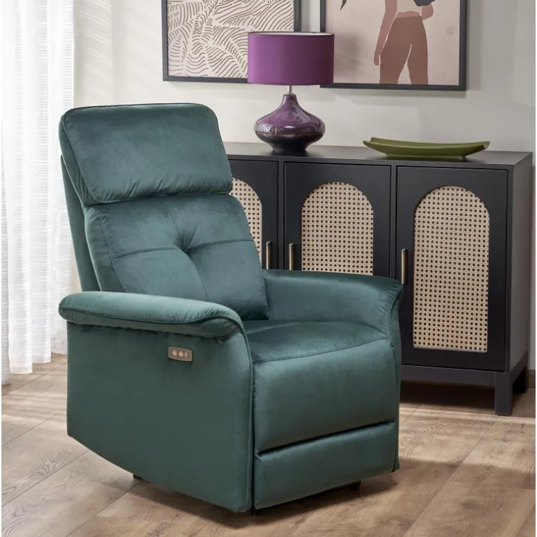 Oplev ultimativ komfort med SEMIR lænestol, mørkegrøn. Denne luksuriøse lænestol er designet med både stil og funktionalitet i tankerne. Med dimensionerne 80/90-170/92-108/46 cm og en elektrisk foldemekanisme samt en USB-port, er den perfekt til afslapning i dit hjem. Stolen er betrukket med blødt fløjlstof i farven grøn – BLUVEL 78, som tilføjer et elegant touch til enhver indretning.