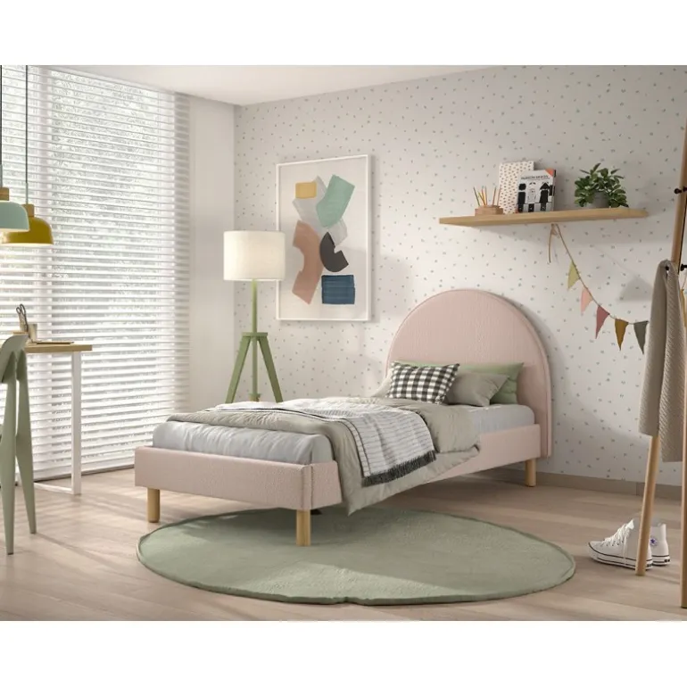 Seng 90×200 cm Moon – lyserød bouclé med rund sengegavl