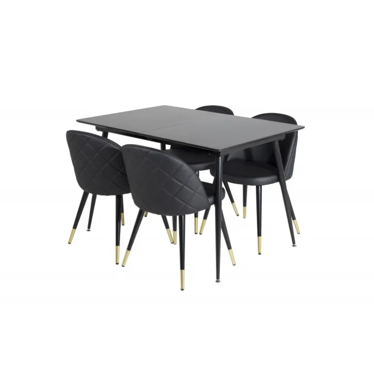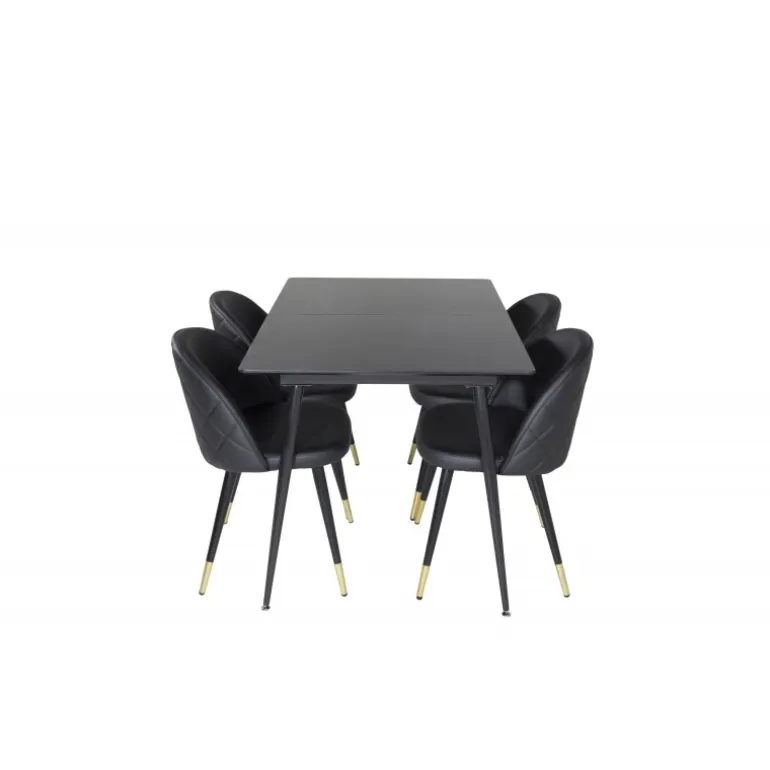 Oplev en moderne og hyggelig spiseoplevelse med Silar Rektangulær Spisebordssæt. Dette sæt kombinerer en stilfuld spisebord i sort MDF med luksuriøse velourstole, som har elegante gulddetaljer ved bunden. Stolene er robuste og komfortable, hvilket gør dem ideelle til lange middage med gode venner. Med sit elegante design og kvalitetsmaterialer bliver dette sæt midtpunktet i dit spiseområde.
