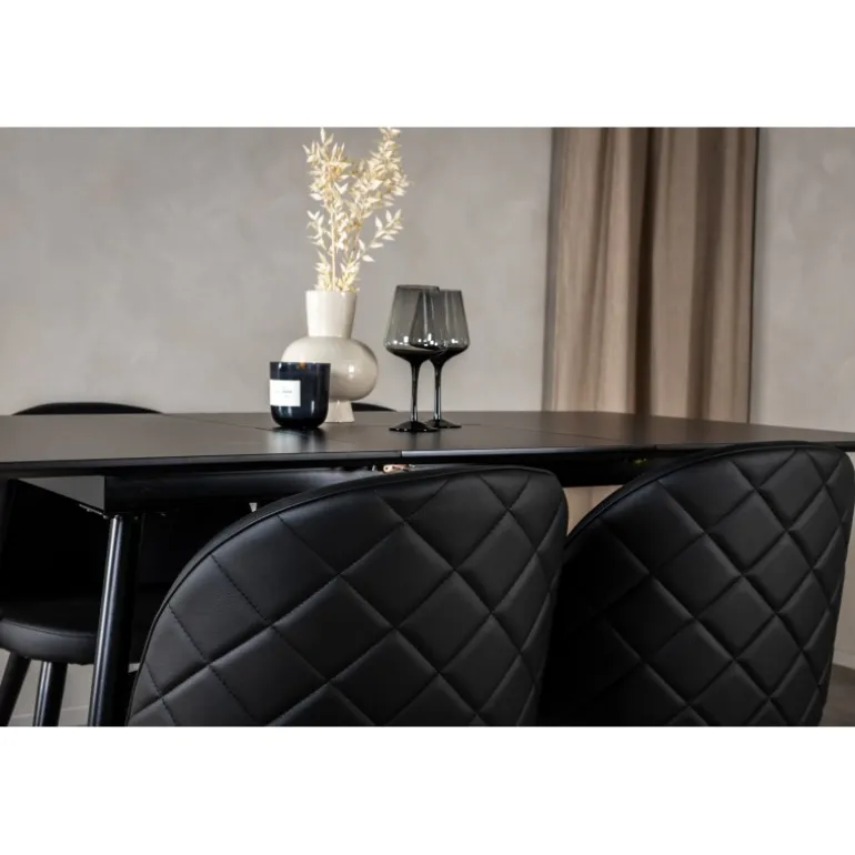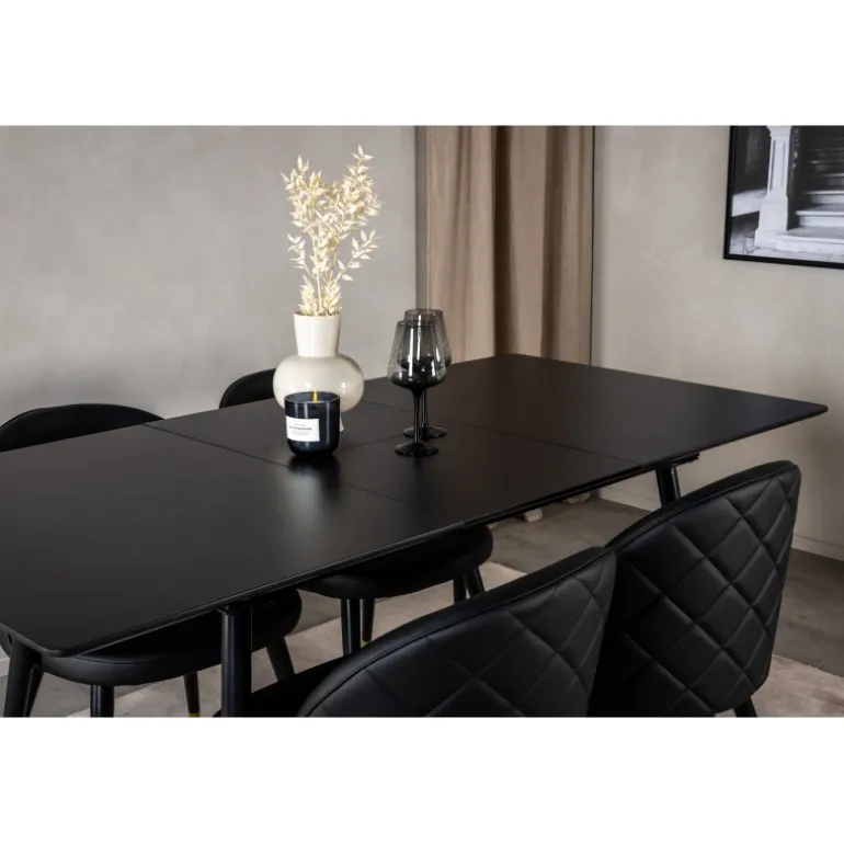 - Moderne design: Stilfuldt sort MDF-bord og luksuriøse velourstole.