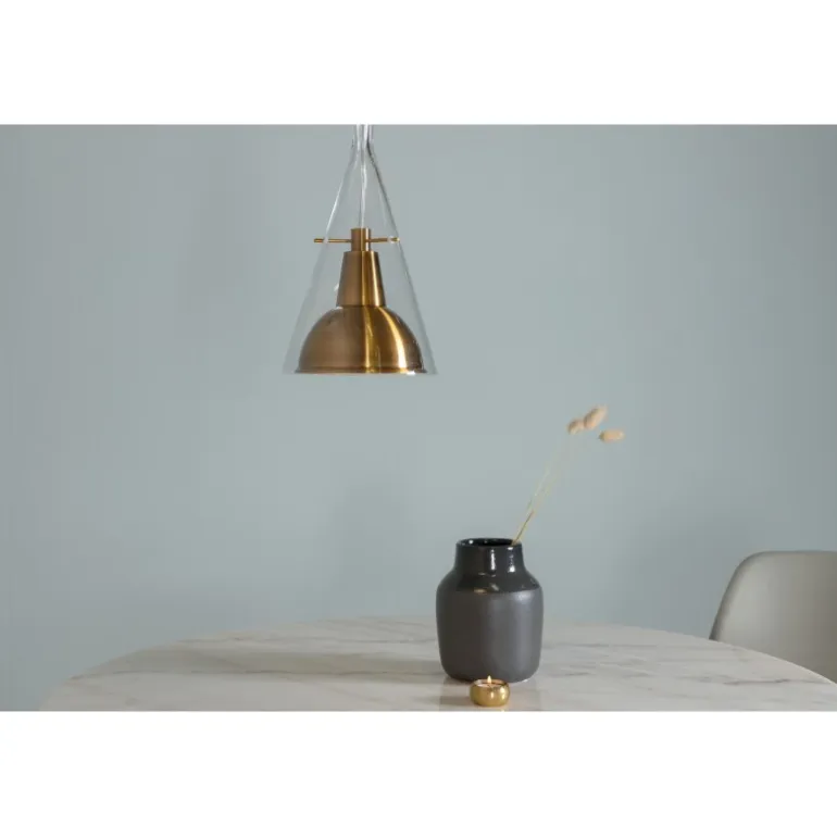 - Materialer af høj kvalitet: Lampeskærm i messingfarvet aluminium og gennemsigtigt glas.