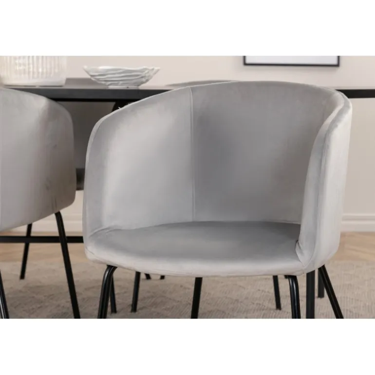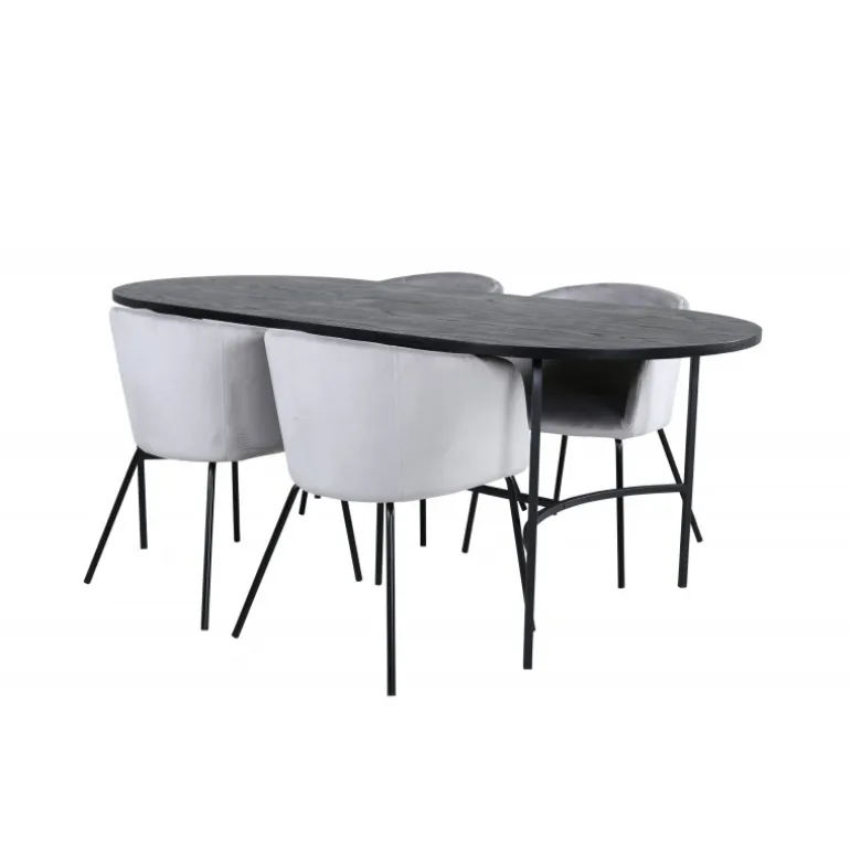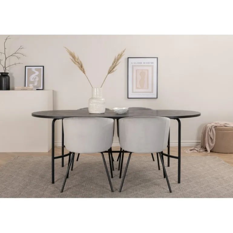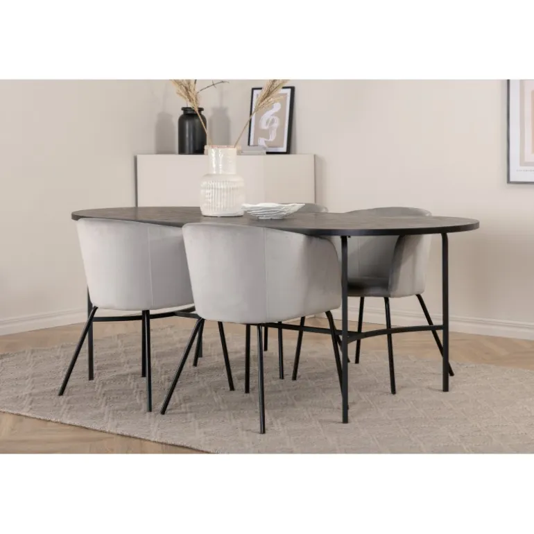 Pompøst og elegant – et madgruppe, der fokuserer på komfort og minimalisme! Vores populære spisebordsstole Berit er en favorit i mange husholdninger. De har et indbydende design og en behagelig grå farve, der er utrolig tiltalende. Sædet er i fløjlsstof, og stolens ben er stilfuldt smalle i sort jern. Stolens dimensioner: Højde: 78 cm, siddehøjde: 49 cm, bredde: 55 cm, dybde: 55 cm. Her matches 4 spisebordsstole med vores ovale spisebord skate. Bordets samlede design er meget gennemtænkt med en tynd topplade i sort MDF med finer og sorte bordben i metal. Bordets dimensioner: Længde: 200 cm, Bredde: 90 cm, Højde: 75 cm.