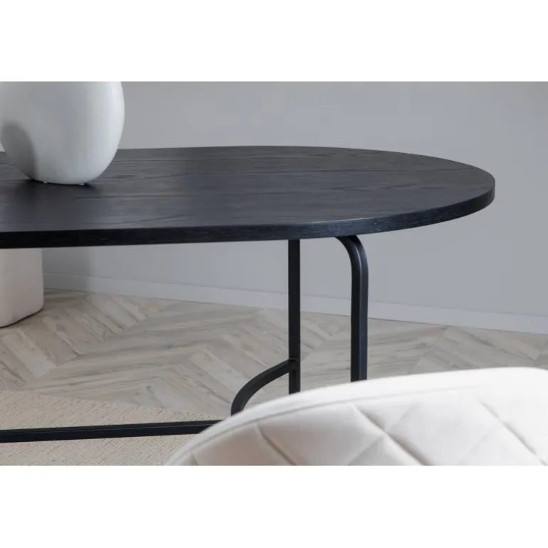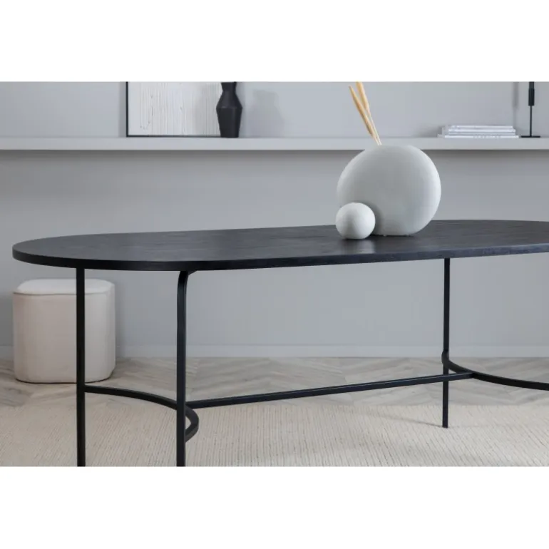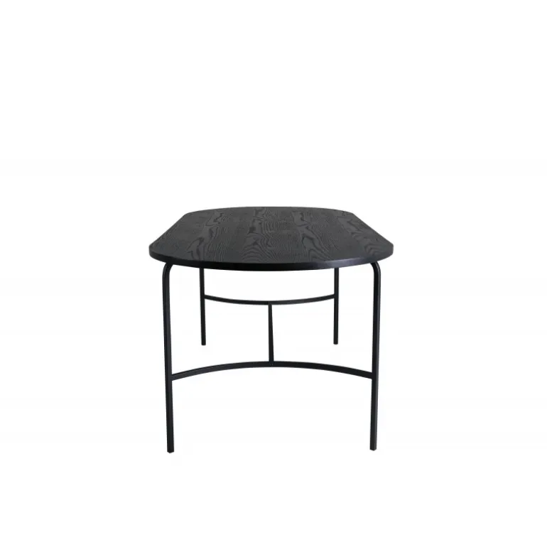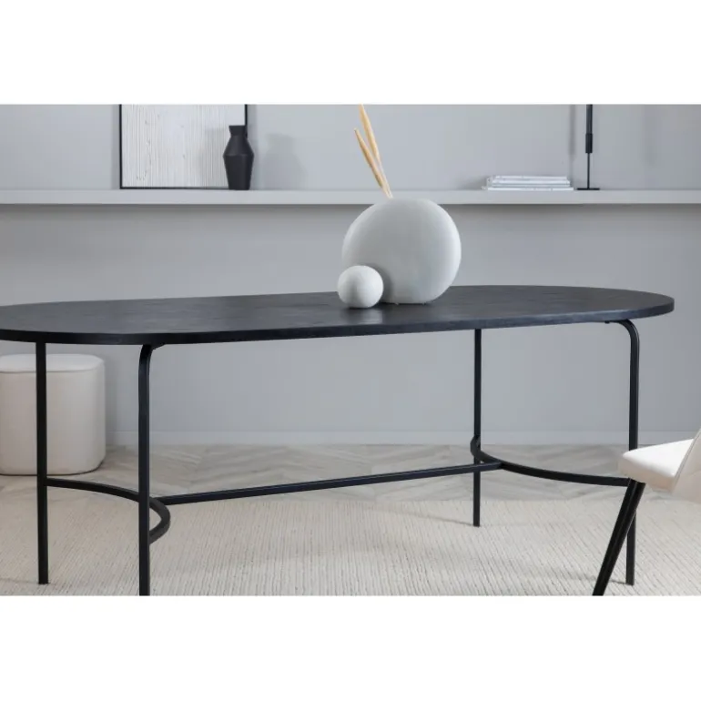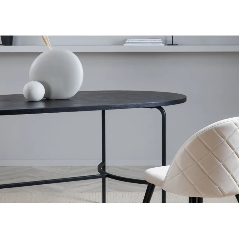Forny dit hjem med et charmerende, stilfuldt og indbydende spisebord fra Skate-serien! Dette ovale bord har et elegant design med en tynd bordplade og en flot designet understel i samme stil. Ovalt spisebordpladen er lavet af MDF i en tidløs sort farve. Det smalle og dekorative understel er i sort pulverlakeret metal. Match med et par komfortable spisebordsstole og nyd et hyggeligt møbel, hvor ingen ender på kanten! Plejeråd: MDF-plader, der er malet eller lakeret, er følsomme over for ridser og skader. Vær derfor forsigtig med pladerne for at undgå dette. Overflader malet med lak med farvepigment eller maling har en pigmentering, der giver en ikke-dækkende transparent overflade.