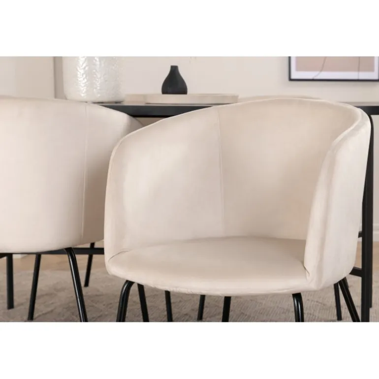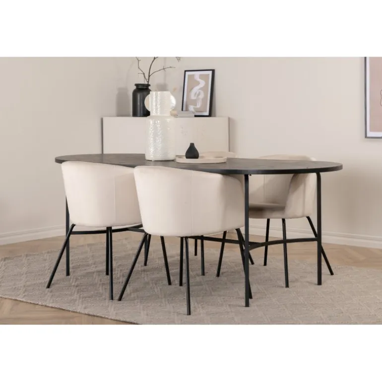 Pompøs og elegant – en Spisebordssæt, der fokuserer på komfort og minimalisme! Vores populære spisebordsstole, Berit, er en favorit i mange husholdninger. De har et indbydende design og en varm farve i beige, som er utroligt tiltalende. Sædet er i velourstof, og stolens ben er stilfuldt smalle i sort jern. Stoledimensioner: Højde: 78 cm, sædehøjde: 49 cm, bredde: 55 cm, dybde: 55 cm. Her matches 4 spisebordsstole med vores ovale spisebord Skate. Bordets overordnede design er meget gennemtænkt med en tynd topplade i sort MDF med finer og sorte bordben i metal. Borddimensioner: Længde: 200 cm, bredde: 90 cm, højde: 75 cm.