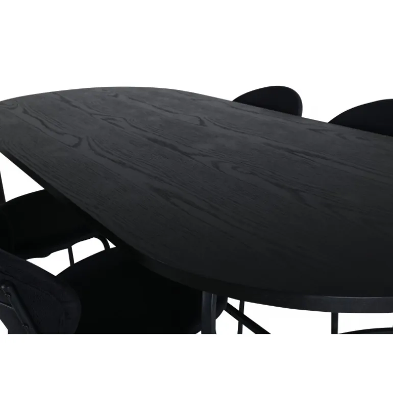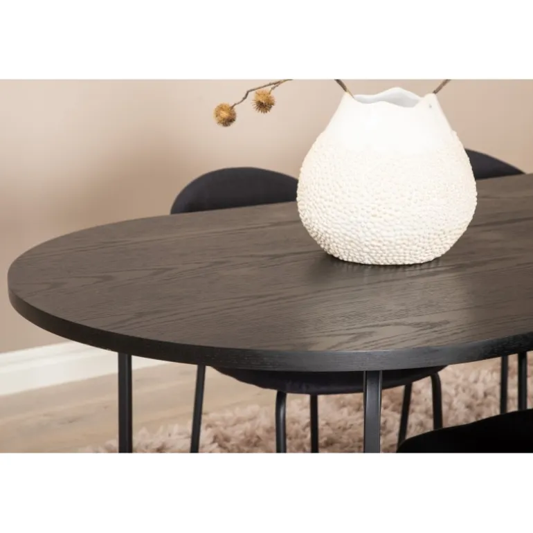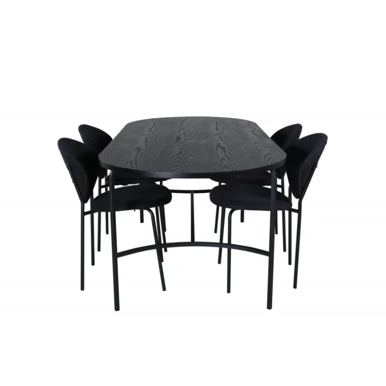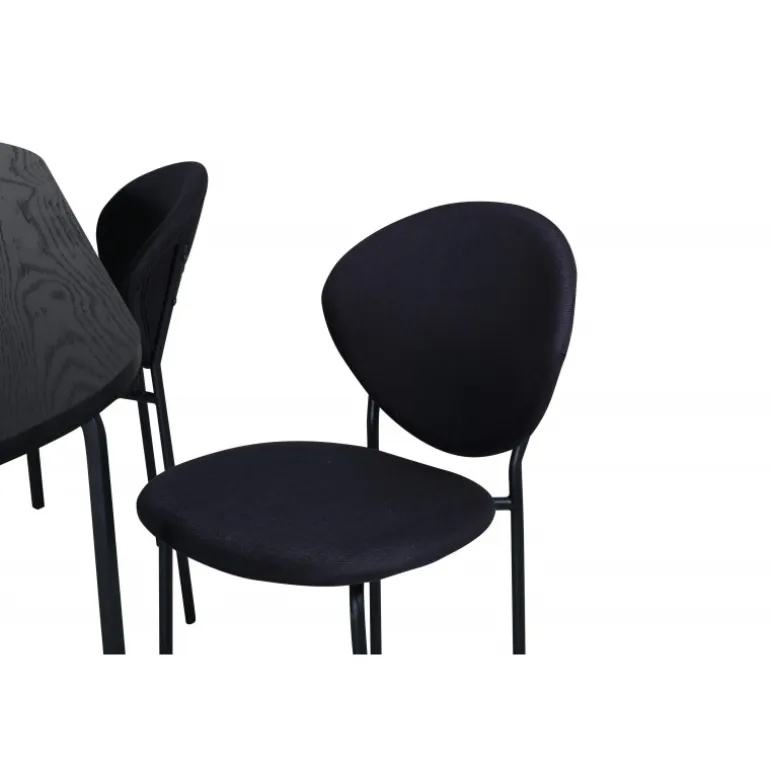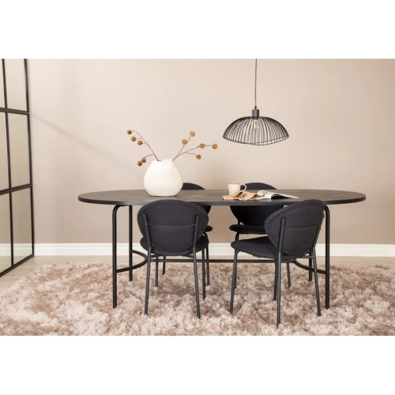 Lad dette smukt matchede Spisebordssæt med en moderne følelse blive et naturligt samlingspunkt i dit hjem. Spisebordet Skate imponerer med sit elegante design og indbydende, ovale form. Det samlede design er meget gennemtænkt med en tynd bordplade i sort MDF med finer og sorte bordben i metal. Bordets dimensioner: Længde: 200 cm, Bredde: 90 cm, Højde: 75 cm. Matchet her med 4 Vault spisestole i et smukt design. Sædet er let afrundet i sort polyesterstof og stolens ben er stilfuldt smalle i sort metal. Stolens dimensioner: Højde: 80 cm, sædehøjde: 49 cm, bredde: 46 cm, dybde: 61,5 cm.