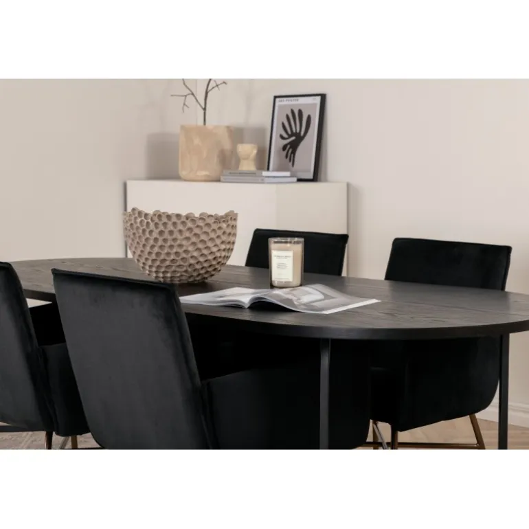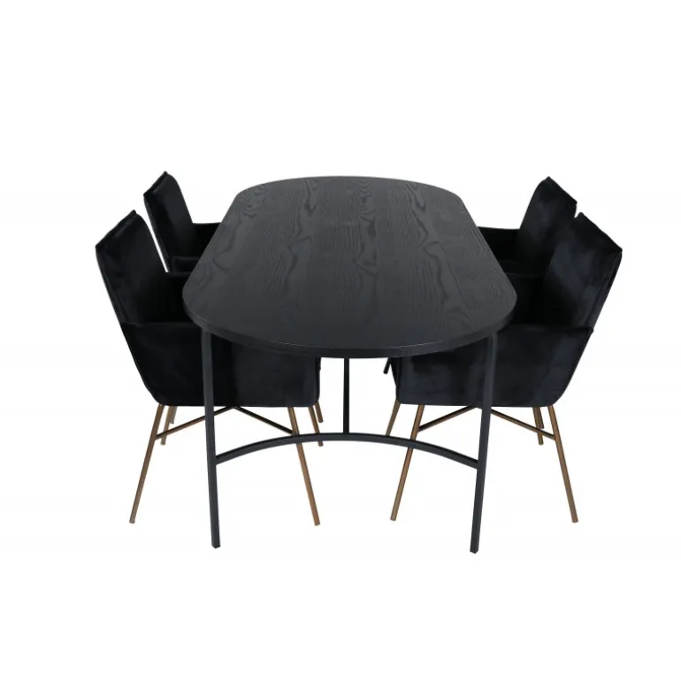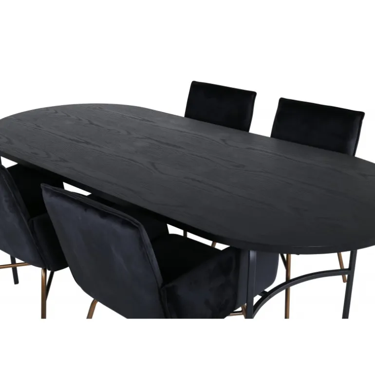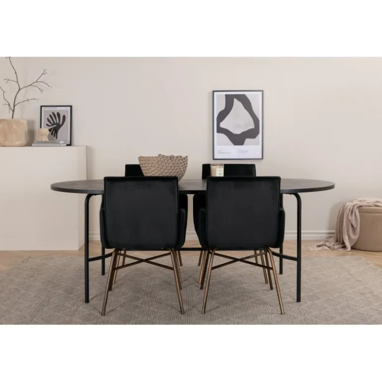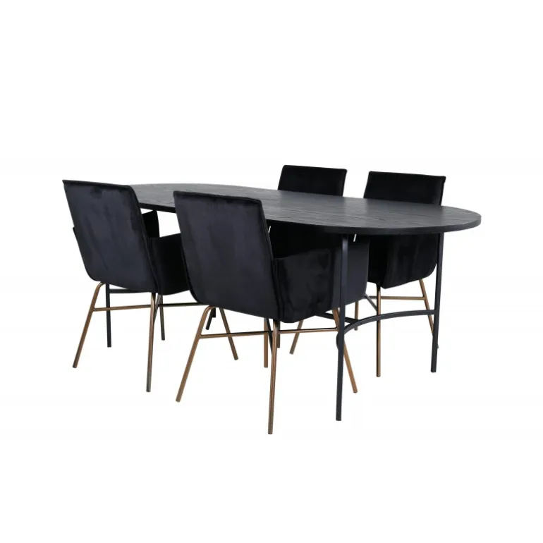 Lad dette smukt afstemte Spisebordssæt med en moderne følelse blive et naturligt samlingspunkt i dit hjem. Spisebordet Skate imponerer med sit elegante design og indbydende, ovale form. Det overordnede design er meget velgennemtænkt med en tynd topplade i sort MDF med finer og sorte bordben i metal. Bordets dimensioner: Længde: 200cm, Bredde: 90cm, Højde: 75cm. Matchet her med 4 Petra spisestuestole i komfortabelt design. Stolebenene er i kobberfarvet jern, og sæderne er indbydende i sort velourstof. Stolens dimensioner: Højde: 87cm, sædehøjde: 48cm, bredde: 57cm, dybde: 60cm.