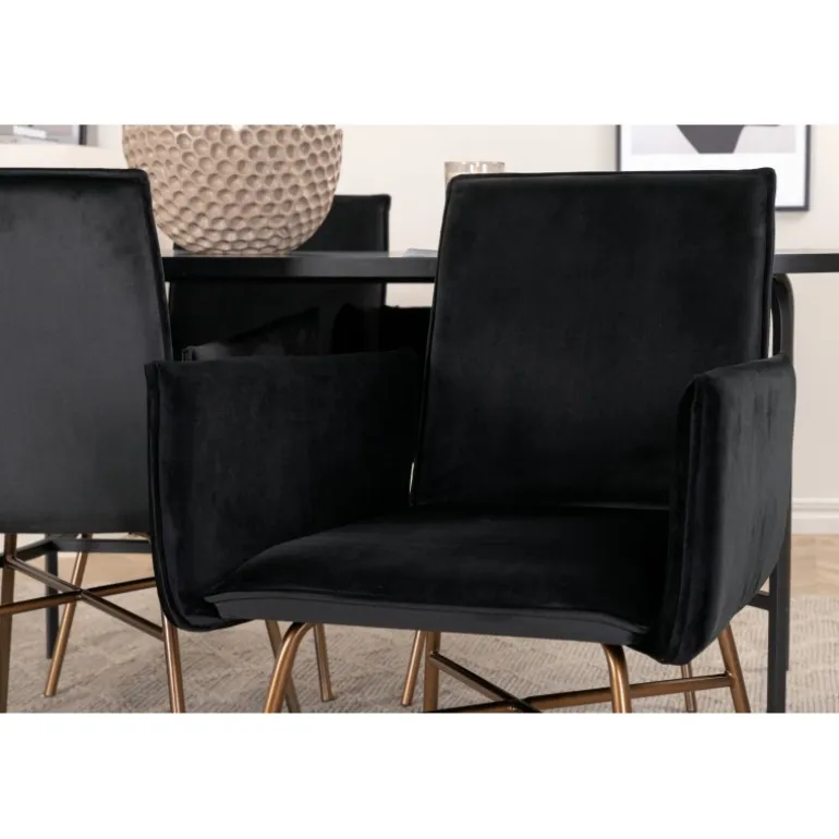 - Komfortable stole: Petra stole med kobberfarvede ben og sort velourstof for maksimal komfort.