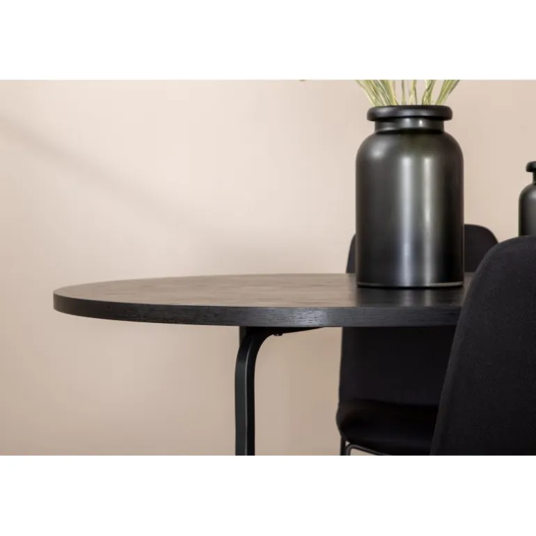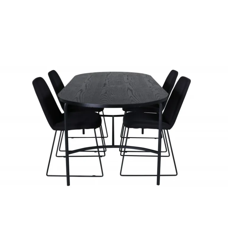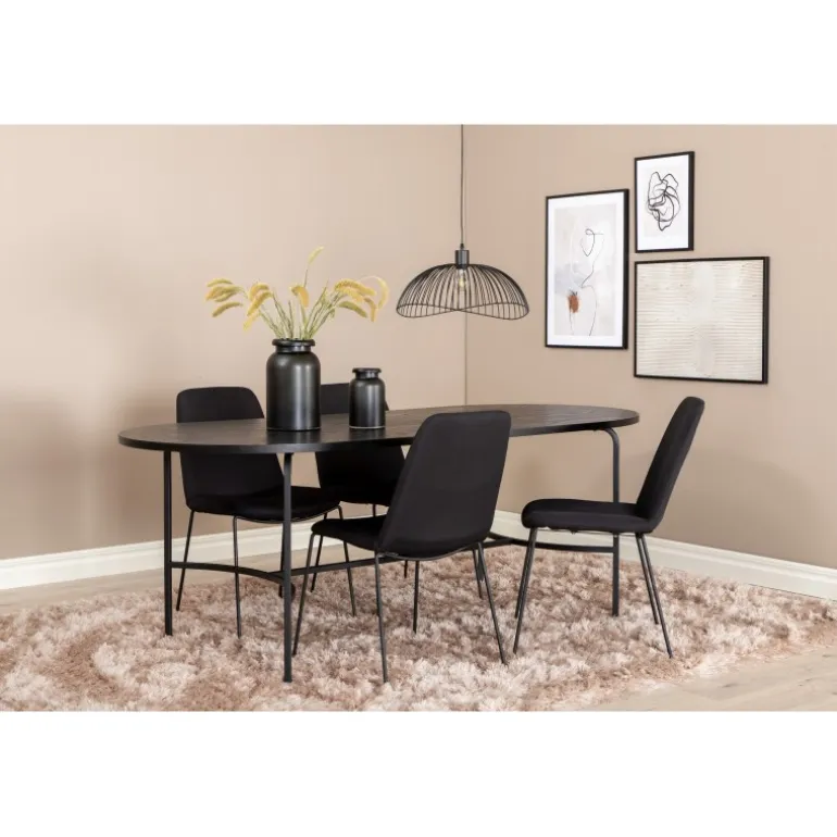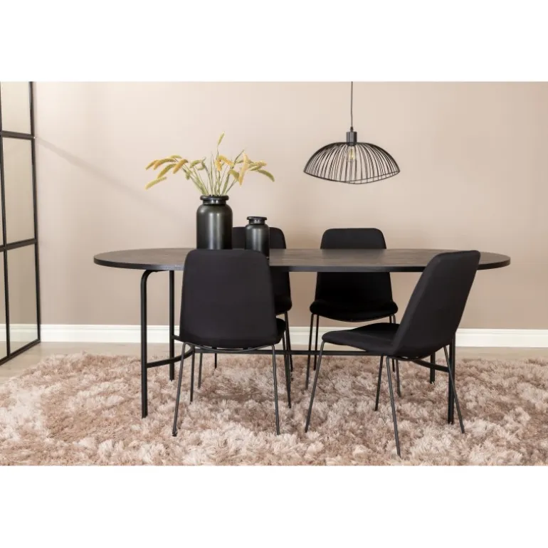 Skate Ovalt Spisebordssæt er perfekt til dem, der søger komfort og stil. Dette spisebord imponerer med sin elegante og indbydende, ovale form. Designet er gennemtænkt med en slank topplade i sort MDF med finer og sorte metalben. Bordets dimensioner: Længde: 200 cm, Bredde: 90 cm, Højde: 75 cm. Sættet inkluderer fire Muce spisebordsstole, der udstråler minimalisme og moderne design. Sædet er lavet af polyester, mens de smalle ben i jern giver et luftigt indtryk i rummet. Stolenes dimensioner: Højde: 84 cm, Sædehøjde: 47 cm, Bredde: 43 cm, Dybde: 63 cm.