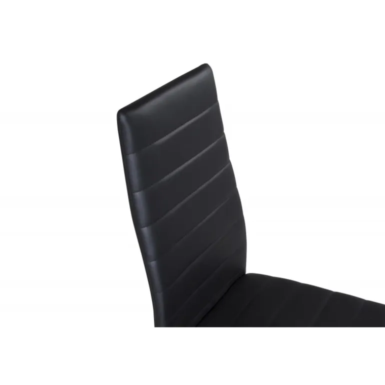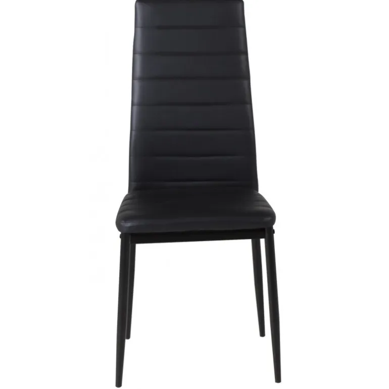 Spisebordsstol Slank har en høj ryg i et fuldt klædt moderne design. Ryg og sæde er i sort kunstlæder med dekorative syninger på indersiden, der danner et stribet mønster, med polstring. Benene er i sort pulverlakeret metal. Her kan du og dine gæster sidde komfortabelt i timevis! Lettere samling kræves. Plejeråd: Ved kraftige pletter anvendes en fugtet bomuldsklud og et middel beregnet til rengøring af bycast & PU. Prøv først på et ikke-synligt område, da nogle midler kan have forskellige sammensætninger.