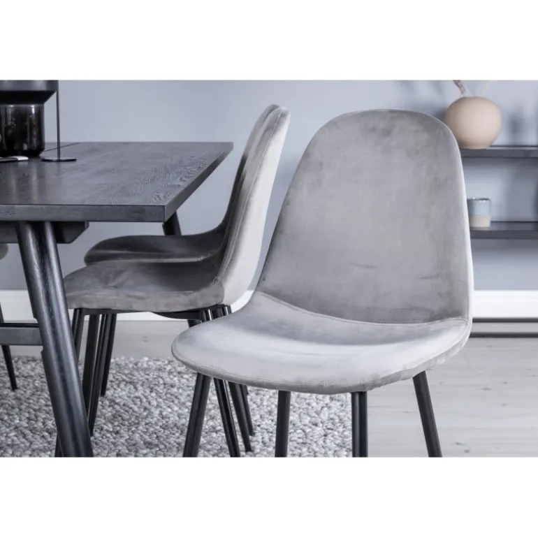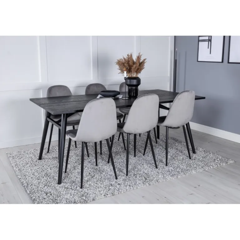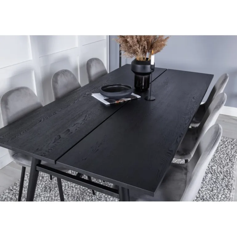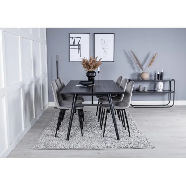 Med det klassiske og moderne spisebord Slank kan hele familien samles til middag og socialt samvær. Her sammen med vores komfortable grå spisestole Polar. Lad tiden ved spisebordet blive en af dagens højdepunkter! Dette Spisebordssæt kombinerer elegant design med funktionalitet og komfort. Sæt består af et sort spisebord med egetræsbordplade og grå spisestole, der passer perfekt til enhver indretning.