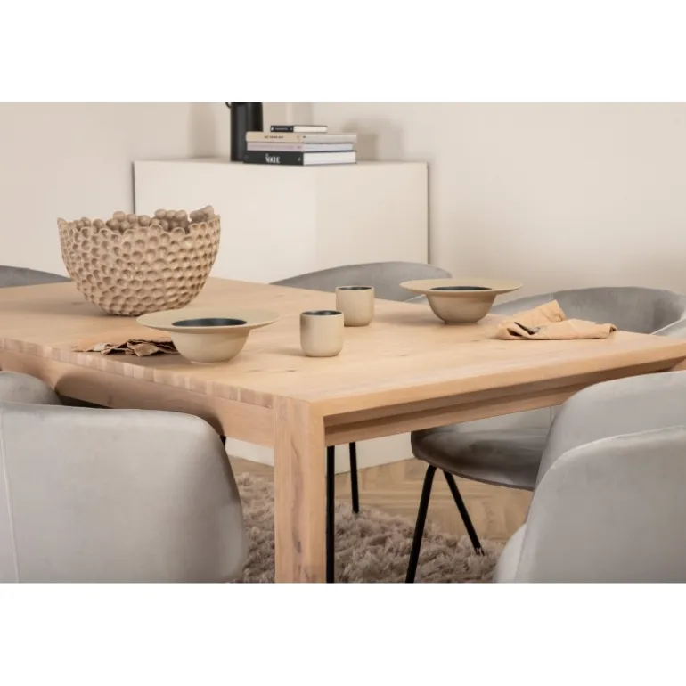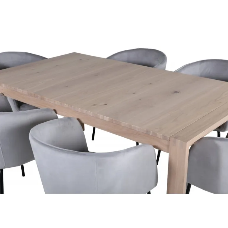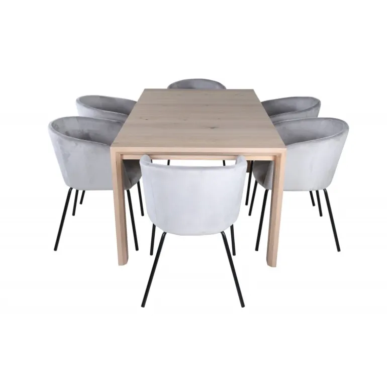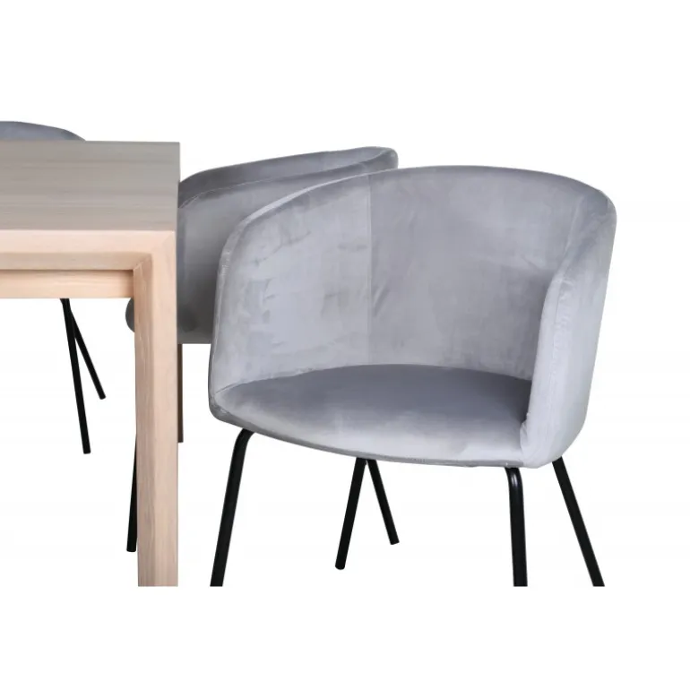 Vores populære spisebordsstole Berit i luksuriøst design forlænger de behagelige middagstunder! Stolen har en generøs sædedybde med et sæde i lysgrå fløjl og stilfulde smalle stoleben i sort jern. Stoledimensioner: Højde: 78 cm, sædehøjde: 49 cm, bredde: 55 cm, dybde: 55 cm. Her matches 6 spisebordsstole med Slider, et udtrækkeligt spisebord i neutral design, der nemt passer ind i de fleste indretningsstile. Bordpladen er knoglehvid i egefiner med spånplade og bordben i eg. Borddimensioner: Længde udtrækkelig mellem: 170 cm og 250 cm, bredde: 95 cm, højde: 75 cm.