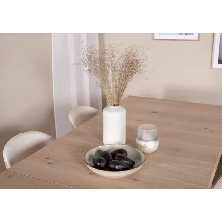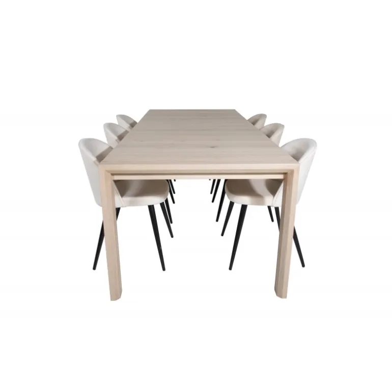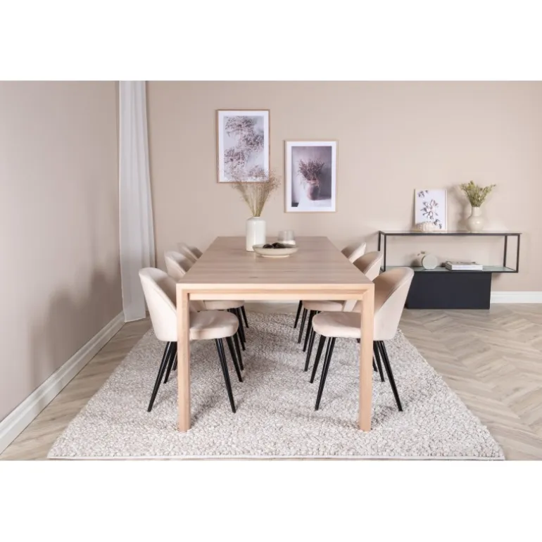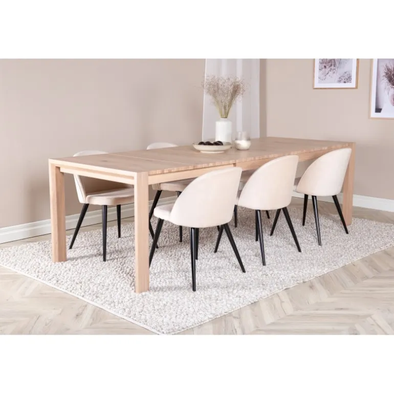 Skab lys i rummet! Kombinationen af det udtrækkelige spisebord Slider og de komfortable spisestole Velvet giver en varm, naturlig og hyggelig atmosfære i ethvert rum. Perfekt til både daglige måltider og specielle lejligheder, dette Spisebordssæt vil forbedre din indretning med sit elegante design og høje funktionalitet. Tilføj et strejf af luksus og komfort til dit hjem med dette stilfulde sæt.