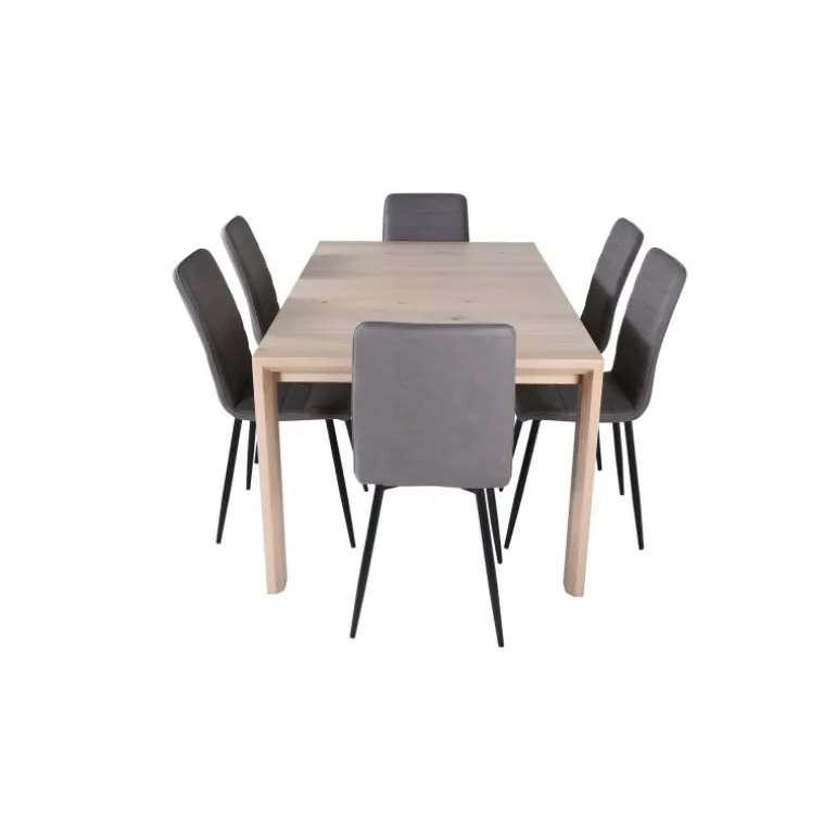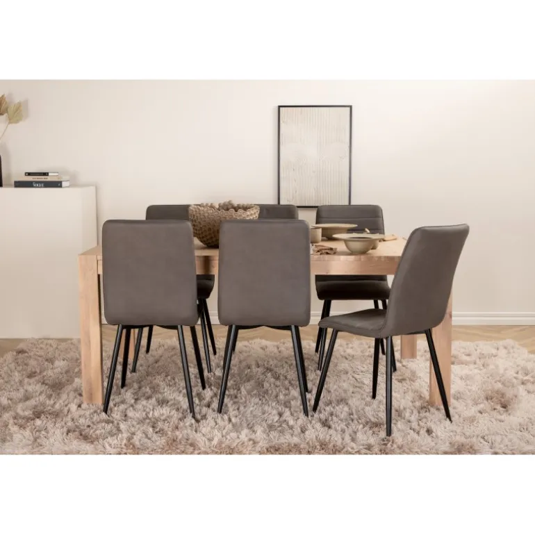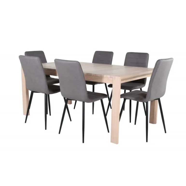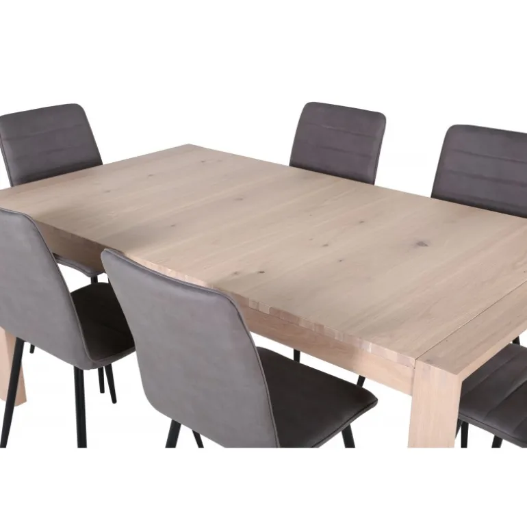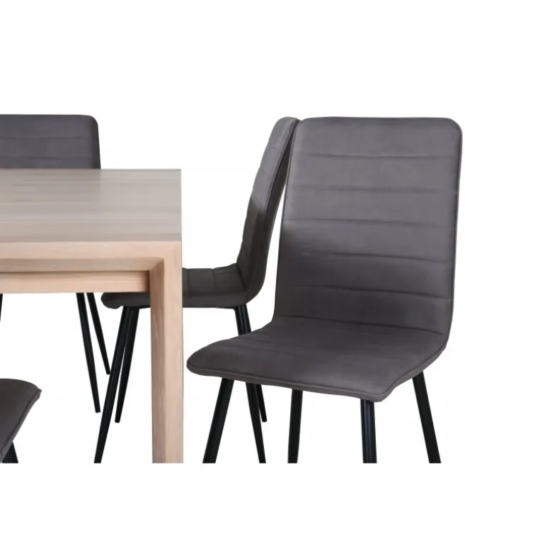 Ingen grund til at gå på kompromis mellem stil og komfort! Vores populære spisebordsstole Windu Luxury i et lige design skaber en behagelig blikfang midt i hjemmet. Stolens ben er i jern, og sæderne er i grå mikrofiber. Stolens dimensioner: Højde: 94 cm, sædehøjde: 47 cm, bredde: 43 cm, dybde: 49 cm. Her matches 6 spisebordsstole med Slider, et udtrækkeligt spisebord i et neutralt design, der let passer ind i de fleste interiørstile. Bordpladen er benhvid i egetræsfiner med spånplade og bordben i eg. Bordets dimensioner: Længde udtrækkelig mellem: 170 cm og 250 cm, bredde: 95 cm, højde: 75 cm.