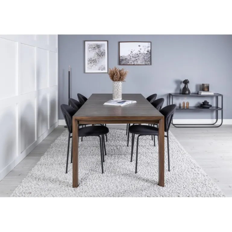 - Elegant Design: Egetræsbord med sortpolstrede stole.