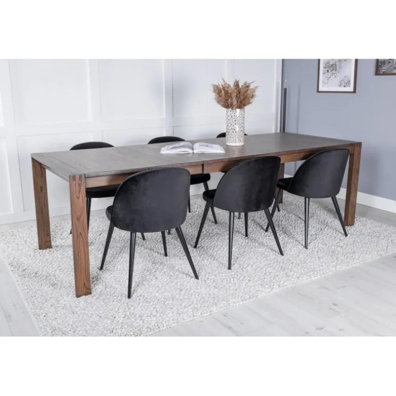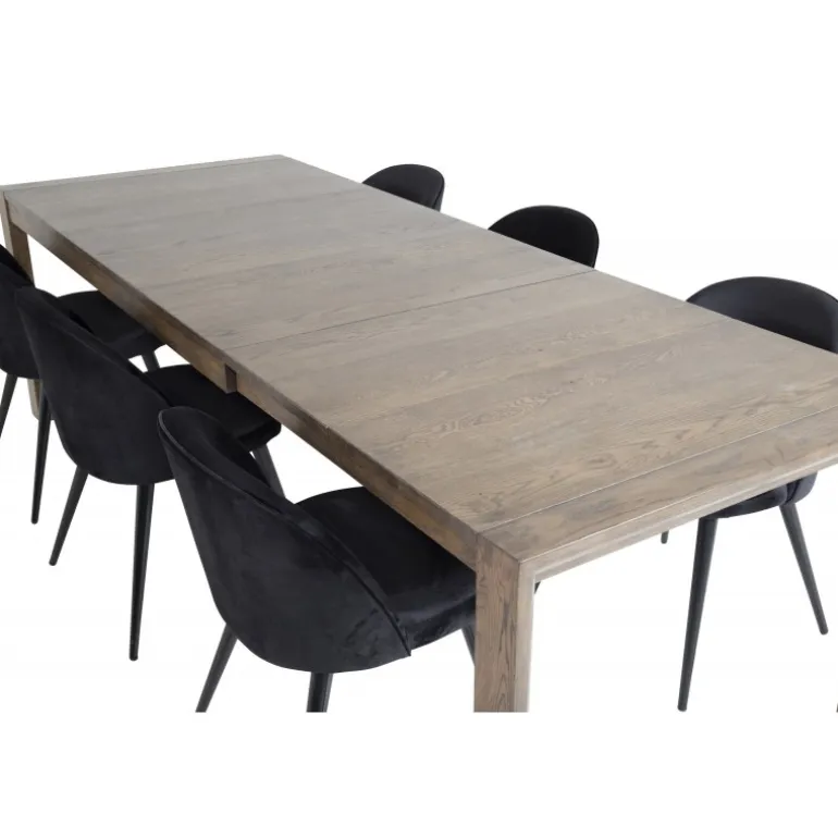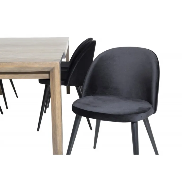 Velkommen til Slider Rektangulært Spisestuesæt! Dette elegante sæt kombinerer vores komfortable velour-spisestole med et stilfuldt spisebord i egelook med udvidelsesmuligheder. Perfekt til både små og store sammenkomster, sætter dette spisebordssæt en ny standard for spisestueindretning. Med materialer som bøjetræ, fibre, skum, polyester velour og stål, er dette sæt både holdbart og æstetisk tiltalende. Fås i farverne sort og natur, dette sæt passer perfekt ind i enhver moderne indretning.