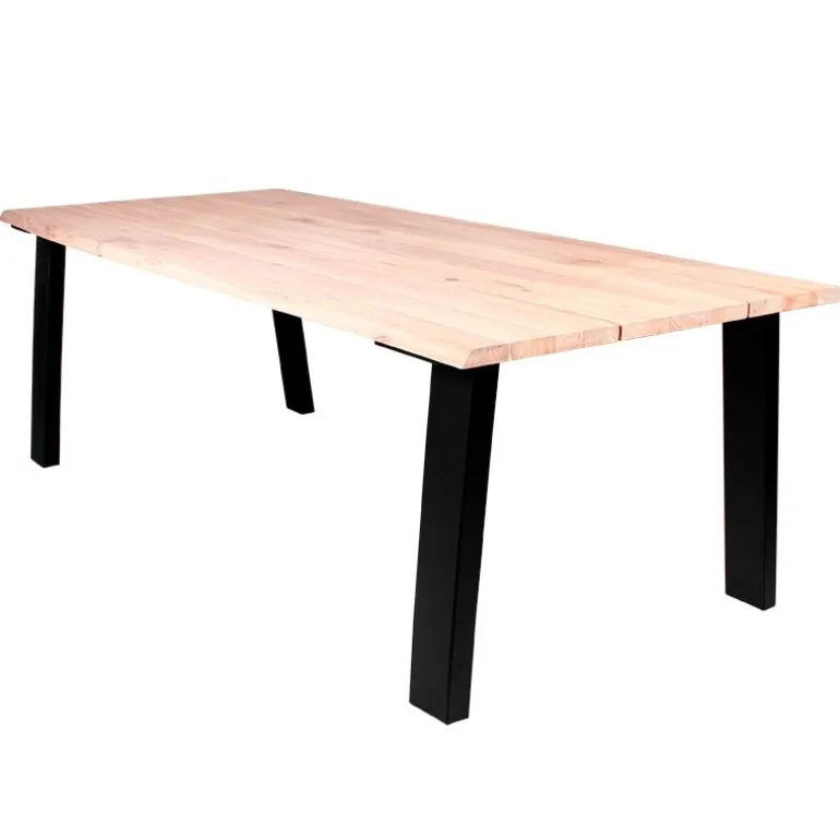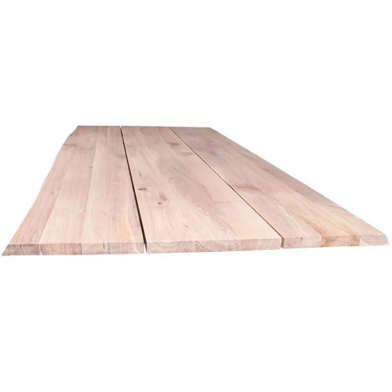 Spisebord af hvid olieret egetræsplanker med natur bølget skrå kanter. Pladen er to delt.