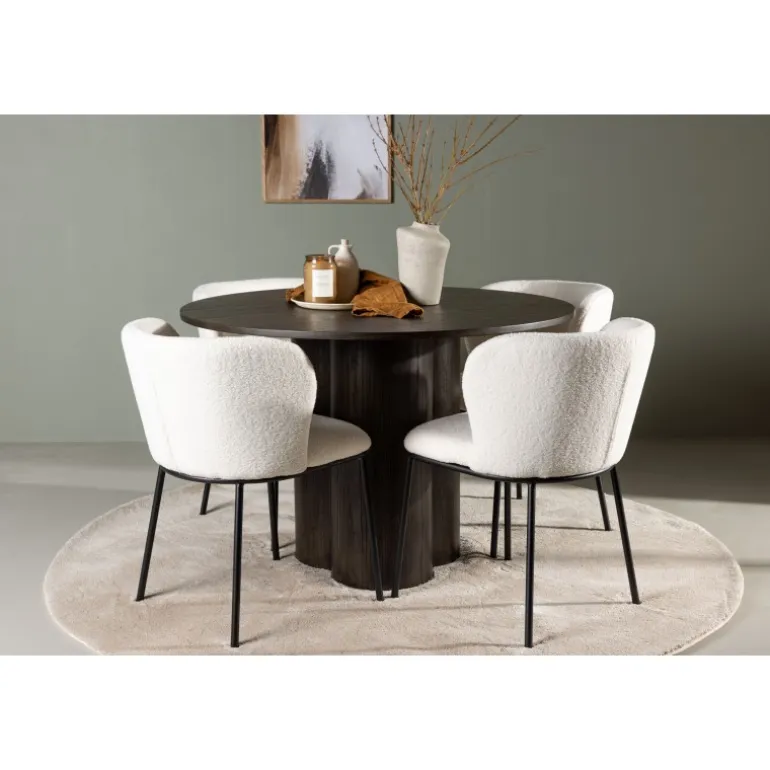 Moderne, elegant og luksuriøs – her får du et spisebordsæt med alle de rigtige funktioner, der vil udstråle varme i dit familiehjem! Vores runde spisebord Olivia imponerer med sine moderne jordfarver i mocca og slanke design. Den tynde, afrundede topflade lavet af MDF giver bordet et elegant touch. Dets tre cylinderformede ben skaber en harmonisk og sammenhængende æstetik, der tiltaler øjet. Hvert eneste detalje er omhyggeligt gennemtænkt for at skabe en samlet helhed. Bordets dimensioner: 110 cm. Sammen med Olivia har vi vores moderne stole Edina, inspireret af de nyeste trends. Stolenes smidige, fuldt polstrede sæde i hvid boucle-stof giver en følelse af luksus og komfort. De sorte metalben på stolene tilføjer et moderne touch til det minimalistiske design. Hvad mere kan man ønske sig? Med dette moderne spisebordsæt kan du skabe en indbydende og stilfuld atmosfære i dit hjem. Hver måltid bliver en oplevelse, hvor du og dine kære kan nyde både design og komfort. Sæt tonen i spisestuen og lad tiden her blive dagens højdepunkt!
