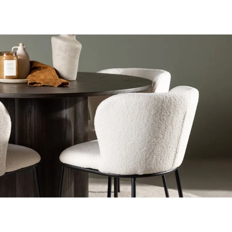 - Komfortable stole: Edina stole med fuldt polstret sæde i hvid boucle-stof og sorte metalben.