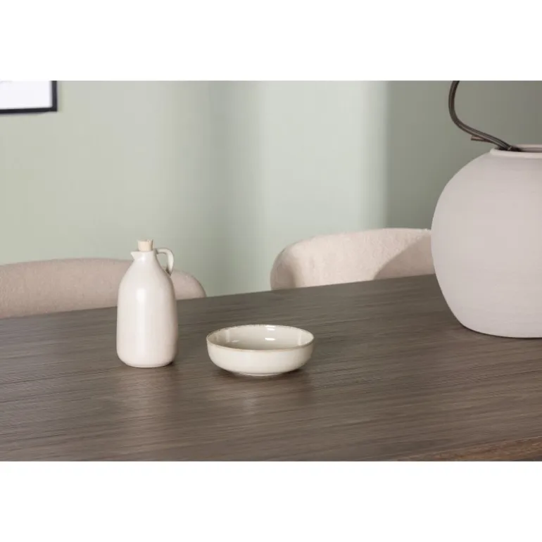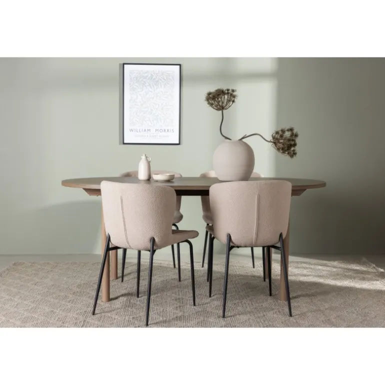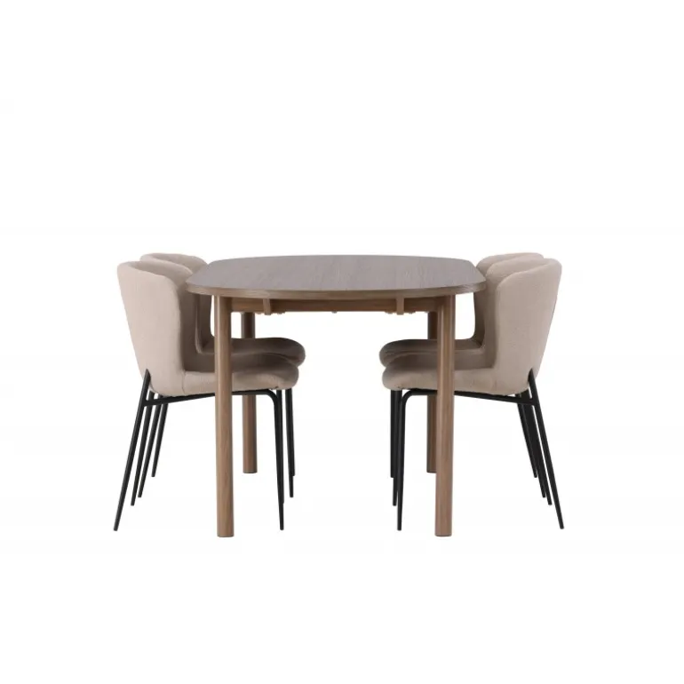 Et modebevidst Spisebordssæt – Gør dig klar til mange hyggelige måltider omkring dette charmerende, ovale spisebord med komfortable spisebordsstole, der udstråler luksus og modernitet! Vores mørkebrune spisebord Andy er den perfekte kombination af minimalistisk stil og uimodståelig charme. Med en oval og slank bordplade lavet af MDF og fire cylinderformede ben får du et klassisk spisebord, der fremhæver det moderne design takket være dets jordfarve. Bordmål: 180x75cm. Her i perfekt kombination med vores charmerende spisebordsstole fra Modesto-serien. Med deres skandinaviske design og beige fluffy stofbetræk skaber disse stole en varm og indbydende atmosfære. De slanke, sorte metalben komplementerer stolens udseende perfekt. Den let afrundede ryg og polstrede sædehynde giver ekstra komfort, så du kan nyde lange og behagelige middage med familie og venner. Det skal føles godt at komme hjem! Dette Spisebordssæt giver dig virkelig den afslapning, du har brug for, og spreder varme og ro i dit hjem, hvilket skaber den hyggelige atmosfære, du længes efter!
