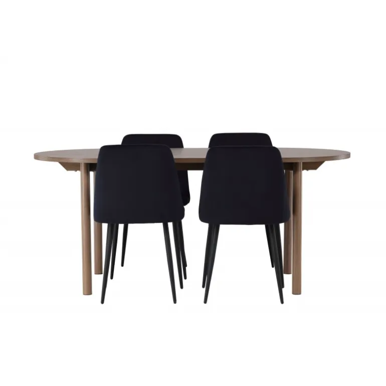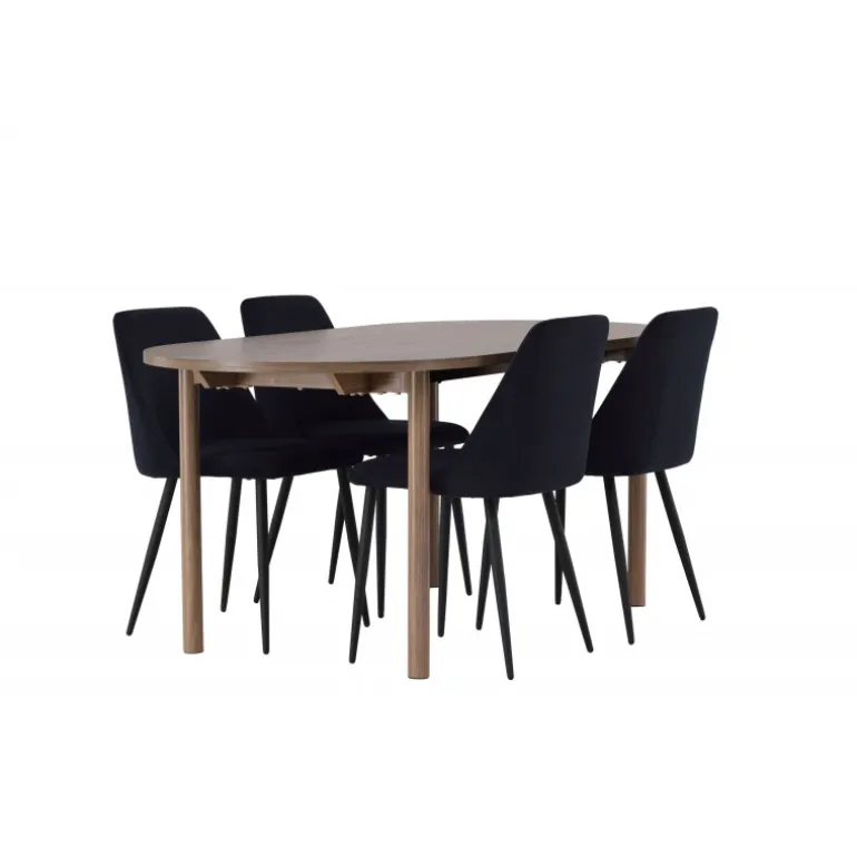 Et vidunderligt Spisebordssæt i skandinavisk stil, der kombinerer bæredygtige materialer med elegante farver, jordnære toner og høj komfort! Vores mørkebrune spisebord Andy er den perfekte kombination af minimalistisk stil og uimodståelig charme. Med en oval og tynd MDF-bordplade og fire cylinderformede ben får du et klassisk spisebord, der forbedrer det moderne design med sin jordnære tone. Bordets dimensioner: 180x75cm. Her har vi matchet det beige spisebord med de vidunderlige sorte stole fra Night-serien for at skabe et komplet og sammenhængende look. Med fuldt polstret sæder i sort velourstof og elegante sortfarvede stoleben tilbyder disse stole en uovertruffen kombination af komfort og stil. Giv dit hjem det elegante touch, det fortjener, med Andy Spisebordssæt og Night stole. Skab minder, nyd god mad, og oplev en følelse af konstant luksus i dit eget hjem!