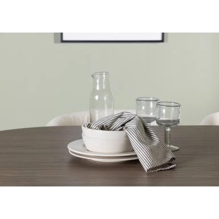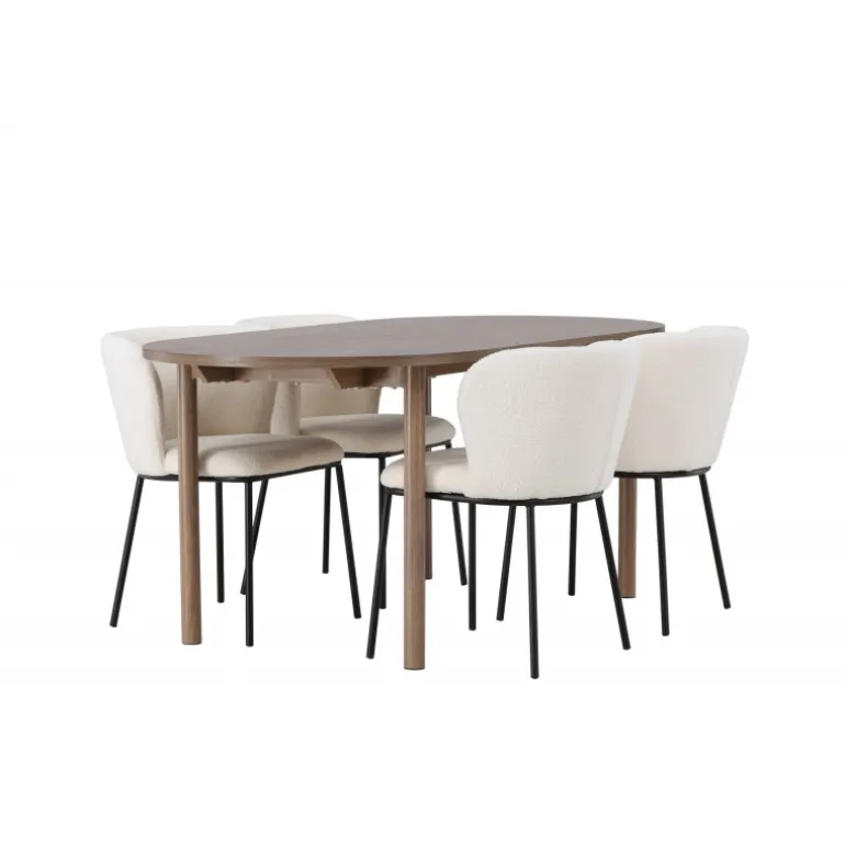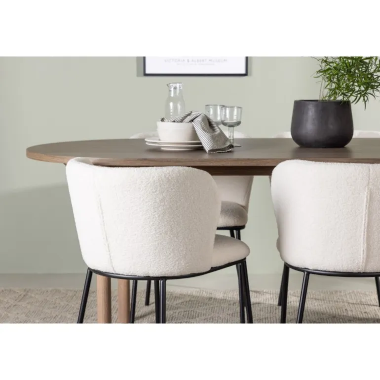 Det bliver ikke meget mere stilfuldt og charmerende end dette. Dette Spisebordssæt kombinerer de bedste nuværende trends med sin skandinaviske stil, bløde former og bæredygtige materialer! Vores ovale spisebord Andy kombinerer elegance og charme på den bedst mulige måde. Den tynde bordplade lavet af MDF og de cylinderformede ben giver en luftig følelse til rummet. Med sin konsekvente naturlige farve er det let at matche spisebordet med din øvrige indretning og skabe en harmonisk atmosfære. Bordet måler: 180×75 cm. Her har vi parret det naturligfarvede spisebord med slanke spisestole fra Edina-serien. Stolen har et sømløst og fuldt polstret sæde i hvid bouclé stof, hvilket tilføjer et luksuriøst touch til din spisestue. De minimalistiske sorte metalben på stolen komplimenterer det slanke design på en elegant måde. Du vil sidde her længe og nyde lækre måltider med familie og venner. Pynt dit hjem med disse fantastiske møbler og nyd et Spisebordssæt, der virkelig vil imponere dine gæster!