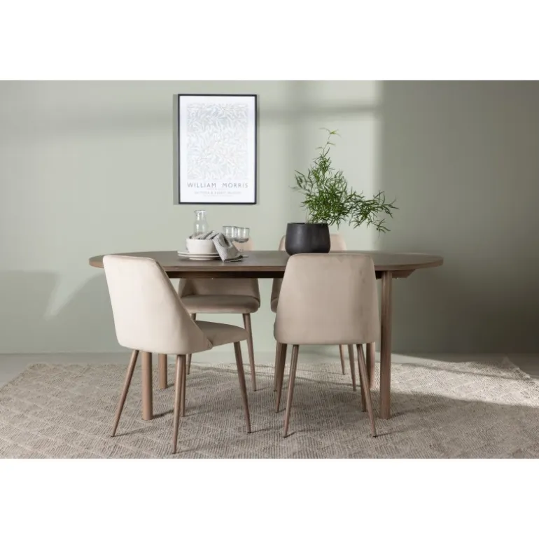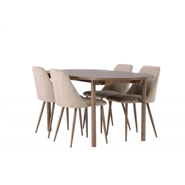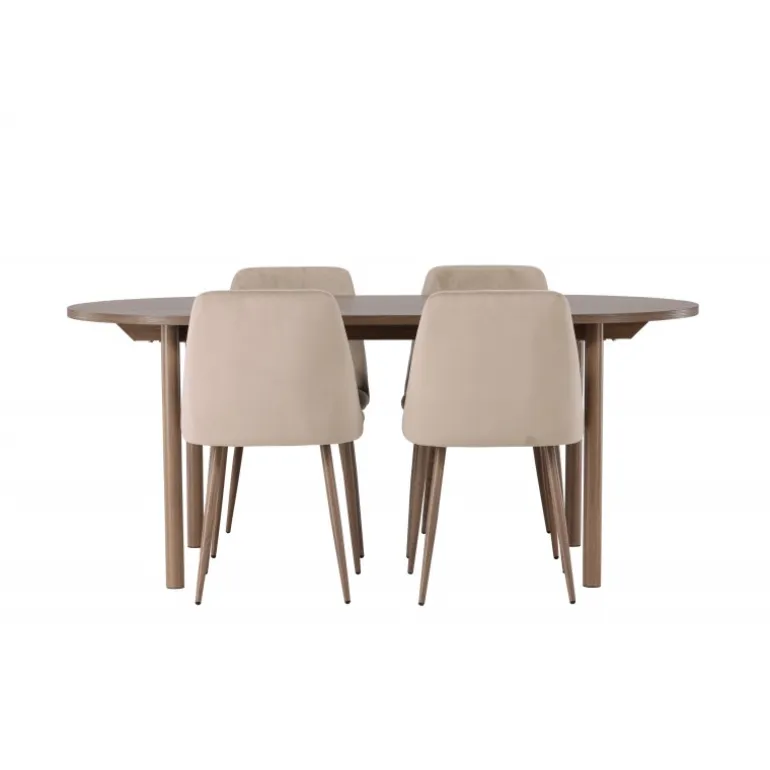 Inviter nære venner og kære til hyggelige måltider omkring et Spisebordssæt, der udstråler fællesskab og stil! Det ovale spisebord Andy er den perfekte kombination af minimalisme og charme. Den slanke, ovale MDF-bordplade og de cylindriske ben bidrager både til stabilitet og æstetik. Bordet har en jævn brun naturlig farve, der er nem at matche med andre interiørstile og aldrig går af mode. Dimensionerne på bordet er 180×75 cm. Sammen med det jordnære spisebord Andy følger de komfortable stole fra Night-serien. Denne stol er ikke kun komfortabel, men også en sand stil-ikon. Med et fuldt polstret sæde i brunt velourstof giver den en følelse af luksus og komfort. De elegante valnøddefarvede stålben på stolen komplementerer designet perfekt og tilføjer et sofistikeret touch. Uanset om du inviterer venner og familie til en festlig middag eller blot nyder et afslappet måltid alene, vil Andy og Night Spisebordssættet give dig en enestående følelse i dit hjem!