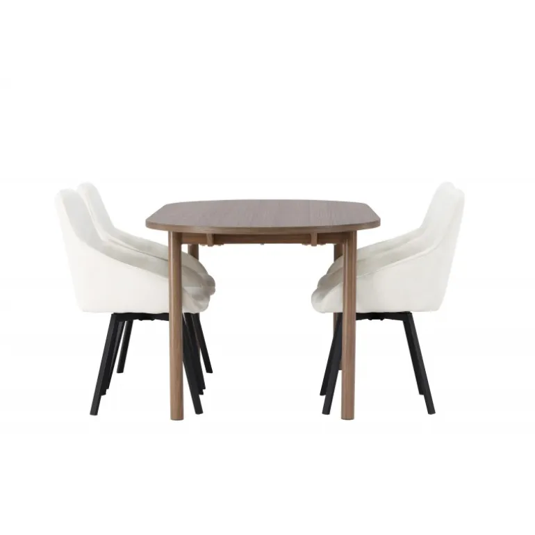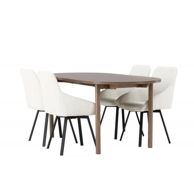 Oplev et lyst og frisk spisebordssæt i stilfulde farver, der nemt matcher anden indretning! Vores ovale spisebord, Andy, kombinerer minimalisme og charme på den perfekte måde. Med en tynd bordplade lavet af høj kvalitet MDF-materiale udstråler dette bord subtil luksus. Farven er jordnær i naturligt træ og føles lige så holdbar som tidløs. Bordets dimensioner er 180×75 cm. Her perfekt matchet med vores komfortable spisestole fra Rosie-serien. Denne dejlige stol i skandinavisk design vil blive din personlige favorit med hensyn til komfort og stil. Stolen har en fuldt polstret sæde i beige stof, der giver et sofistikeret touch, og integrerede armlæn, der tilbyder ekstra støtte og afslapning. De let spredte stoleben i sort metal giver et moderne og elegant udtryk til hele spisebordssættet. Skab mindeværdige øjeblikke med familie og venner omkring dette fantastiske spisebord og nyd den ultimative komfort, som Rosie-stolen tilbyder. Sæt tonen i spisestuen med dette indbydende spisebordssæt – ingen vil blive overset!