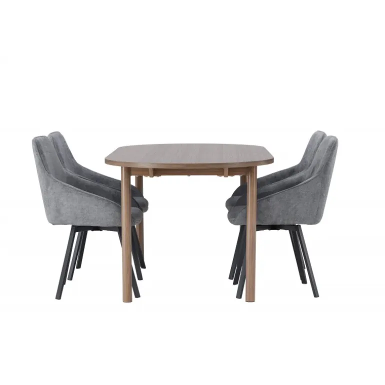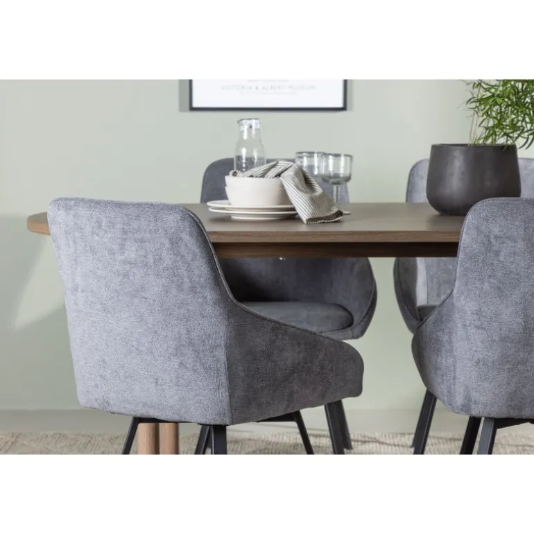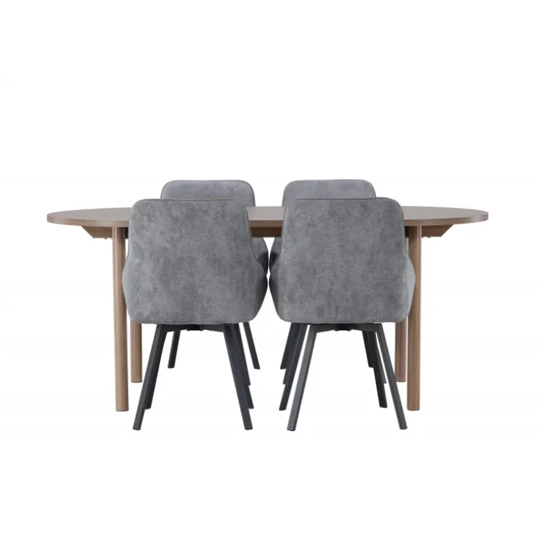 Et Spisebordssæt i behagelige farver, der er nemme at matche med anden indretning og stil! Vores ovale spisebord, Andy, er den perfekte kombination af minimalisme og charme. Med en slank bordplade lavet af højkvalitets MDF-materiale udstråler dette bord subtil luksus. Farven er jordnær i naturligt træ og føles lige så holdbar som tidløs. Bordets dimensioner: 180×75 cm. Her perfekt matchet med vores komfortable spisestole fra Rosie-serien. Denne dejlige stol i skandinavisk design vil blive din personlige favorit inden for komfort og stil. Stolen har et fuldt polstret sæde i gråt stof, der tilføjer et sofistikeret touch, og integrerede armlæn, der giver ekstra støtte og afslapning. De blidt buede sorte metalben på stolen giver et moderne og elegant udtryk til hele Spisebordssættet. Skab mindeværdige øjeblikke med familie og venner omkring dette fantastiske spisebord og nyd den ultimative komfort, som Rosie-stolen tilbyder. Sæt tonen i spisestuen med dette indbydende Spisebordssæt – ingen vil blive efterladt på kanten!