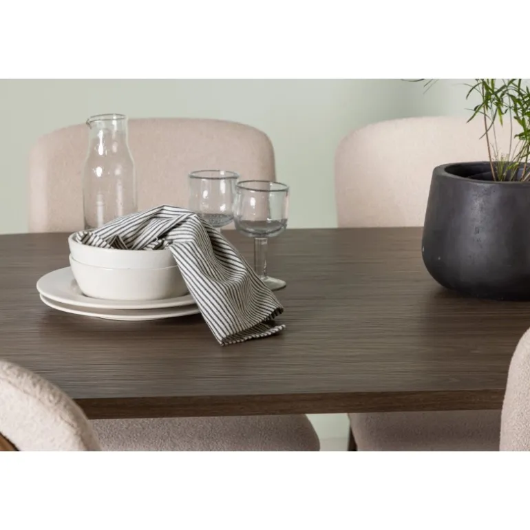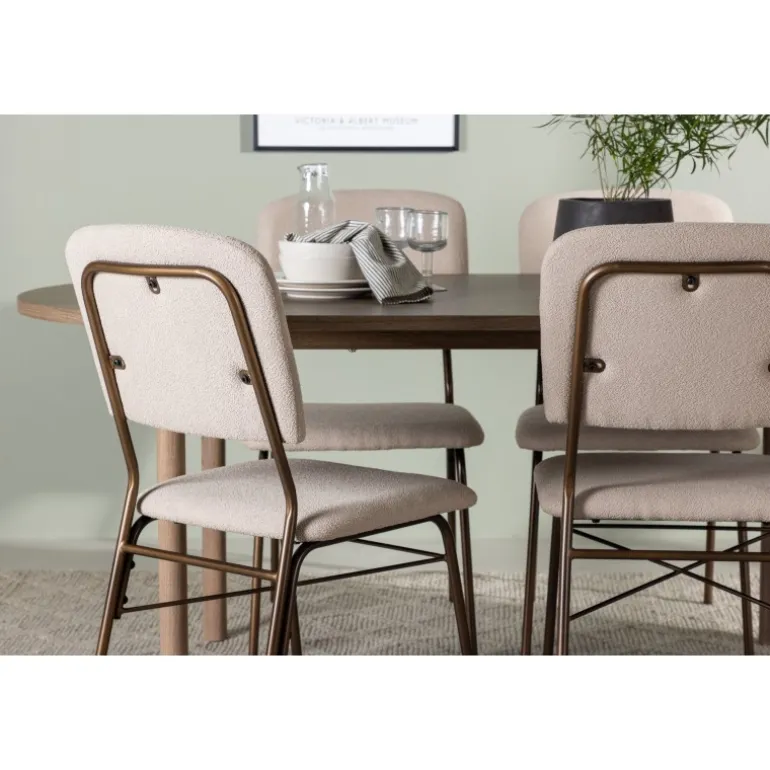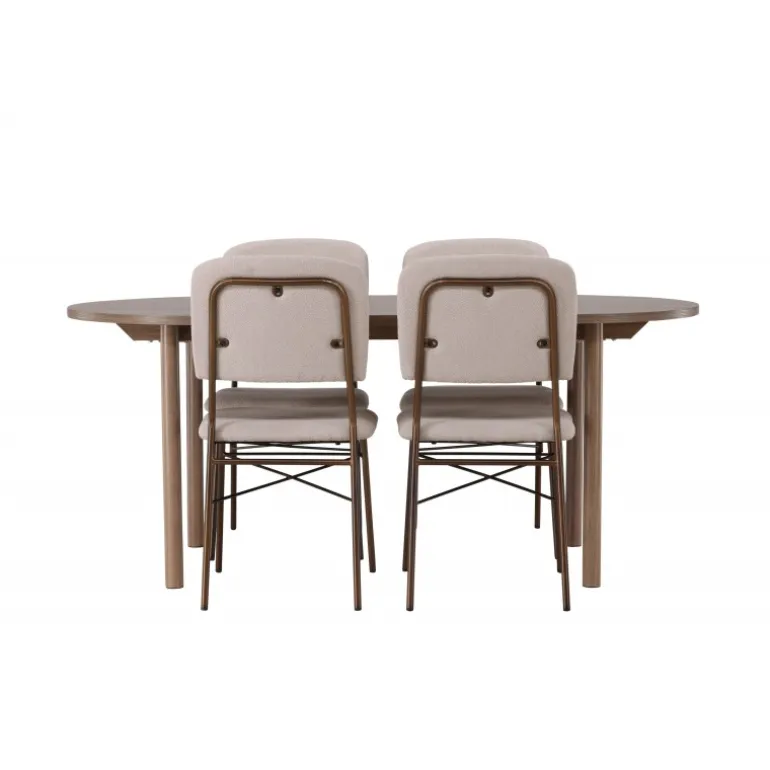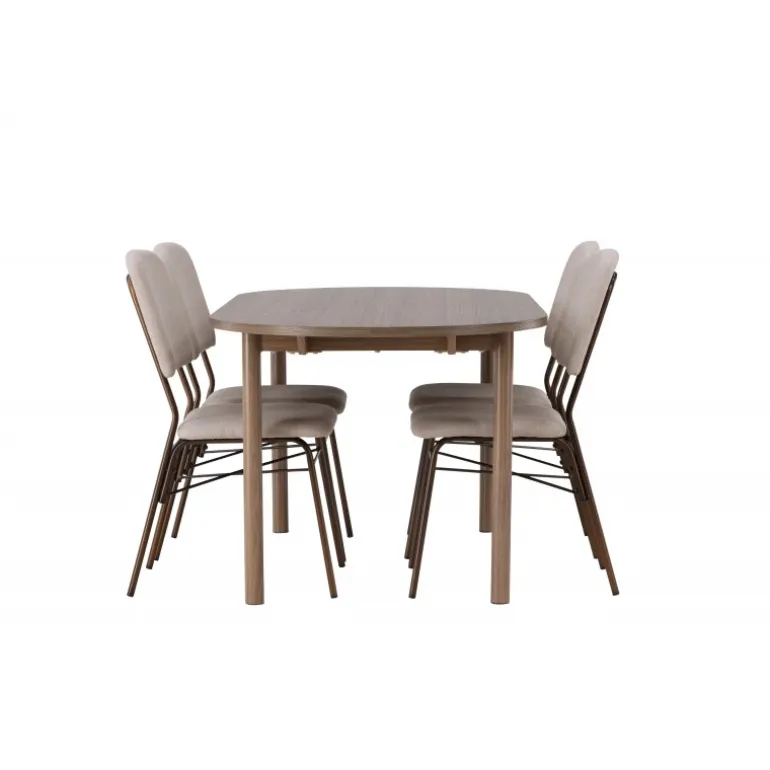 Et Spisebordssæt der udstråler minimalistisk charme! Indret hjemmets hjerte med jordfarver, bløde materialer og blide former. Med vores ovale spisebord Andy får du den perfekte kombination af stil og funktionalitet. Det ovale bord er designet med et slankt og klassisk design, der vil forbedre indretningen i dit hjem. Med en tynd MDF-bordplade i en varm, mørkebrun farve og fire klassiske, cylinderformede ben, giver Andy en følelse af raffineret enkelhed. Bordets dimensioner: 180×75 cm. Her har vi matchet det brune bord med beige spisestole fra Seda-serien. Denne stol er skabt i overensstemmelse med de nyeste trends og går ikke på kompromis mellem stil og komfort. Det smukke beige polyesterstof med tekstur giver en luksuriøs følelse og skaber en indbydende atmosfære. De mørkebrune stålben på stolen giver en stærk og solid base, der perfekt komplementerer spisebordet. Med den jordfarvede kombination bliver dette Spisebordssæt både stilfuldt og nemt at matche med andre møbler i dit hjem. Giv dit hjem den perfekte kombination af stil, komfort og funktionalitet!