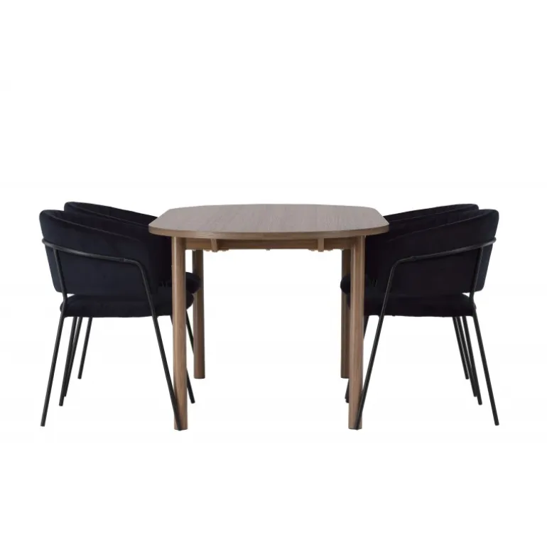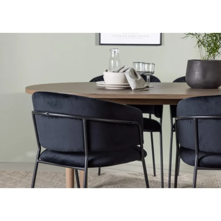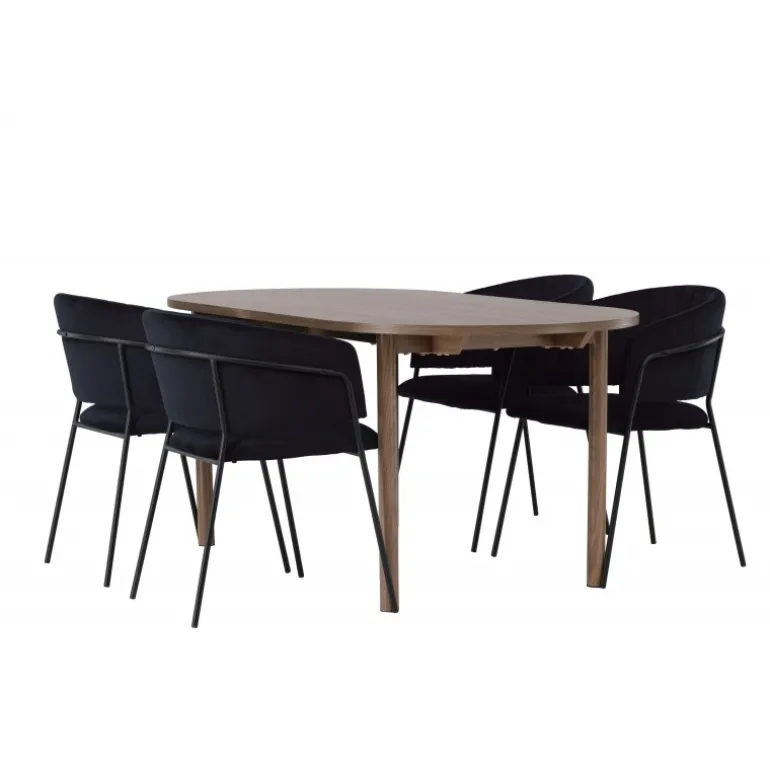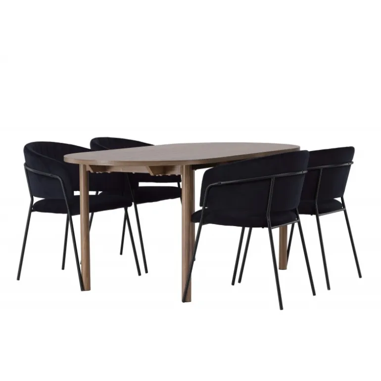 Spisebordssættet Andy med stole Selma tilbyder en distinkt og unik stil til din spisestueindretning. Med en naturlig farvepalet bringer Andy spisebordet en jordnær og varm følelse til rummet. Bordpladen i MDF og de sorte stålben giver et robust og moderne udtryk. Med mål på 180×90 cm og en højde på 75 cm skaber det en imponerende og funktionel overflade til middage og sociale sammenkomster. Selma stolene løfter designet med deres trendy og elegante, fuldt polstrede sæder i sort polyesterfløjl. Stolenes sorte stålben, med deres let udadgående former, giver ikke kun stabilitet, men også en unik visuel effekt. De let rundede rygge på stolene tilbyder ekstra komfort og en afslappet atmosfære omkring bordet. Med Andy spisebord og Selma stole får du mere end blot et almindeligt Spisebordssæt; du får en raffineret og unik interiørdetalje, der løfter hele rummets atmosfære til nye højder. Med kombinationen af gennemtænkt design og trendsans skaber dette ensemble et spændende og personligt udtryk til dit hjem.