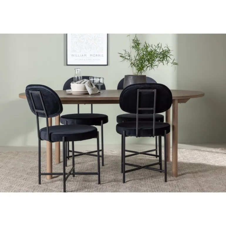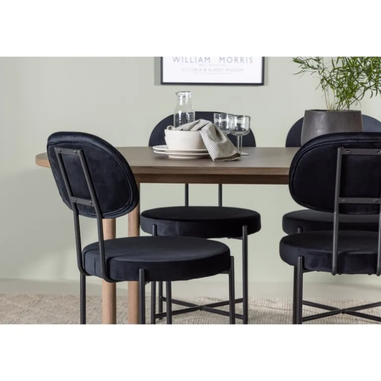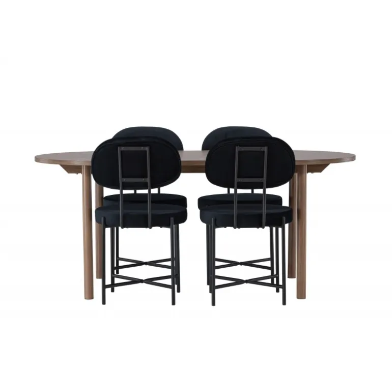 Velkommen hjem til et moderne Spisebordssæt i jordfarver, bløde materialer og slanke former! Vores mørkebrune spisebord, Andy, har et charmerende design og en klassisk opstilling. Med en oval, tynd bordplade lavet af høj kvalitet MDF-materiale, tilbyder dette bord et smagfuldt og moderne look, der vil imponere både familie og venner. Bordbenene er slanke og klassisk cylindriske. Den mørkebrune træfarve har et tidløst og moderne udseende, der aldrig går af mode. Bordets dimensioner er 180×75 cm. Her, i perfekt kombination, er vores slanke sorte spisestole fra Stella-serien. Stolenes trendy skandinaviske design tilføjer et sofistikeret touch til din indretning. Det runde sæde og ryglæn i sort velourstof giver en elegant og luksuriøs følelse, mens de minimalistiske sorte stålstoleben tilbyder en moderne og robust struktur. Med dette Spisebordssæt vil du kunne nyde hvert måltid med stil og komfort. Den designrige siddeposition og de eksklusive materialer i både bord og stole vil give dig en følelse af luksus og velvære!