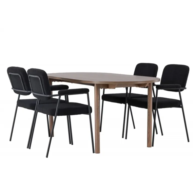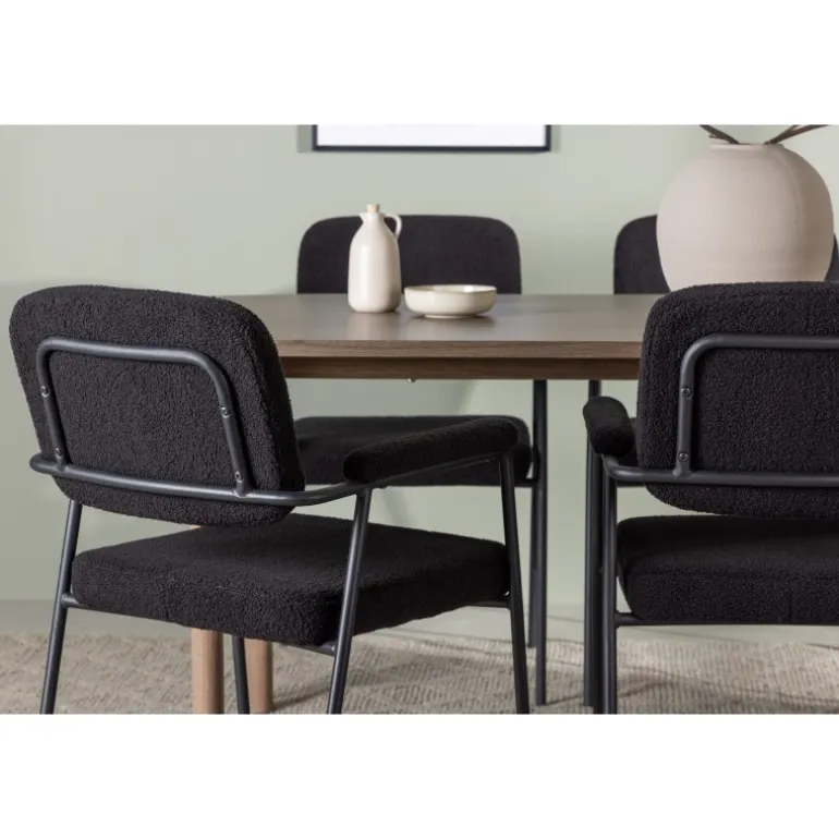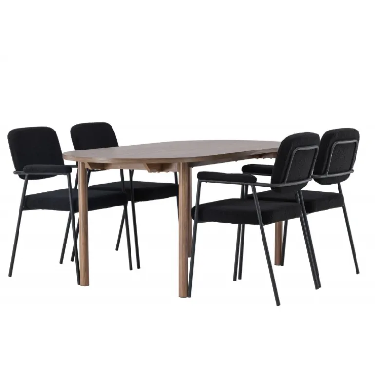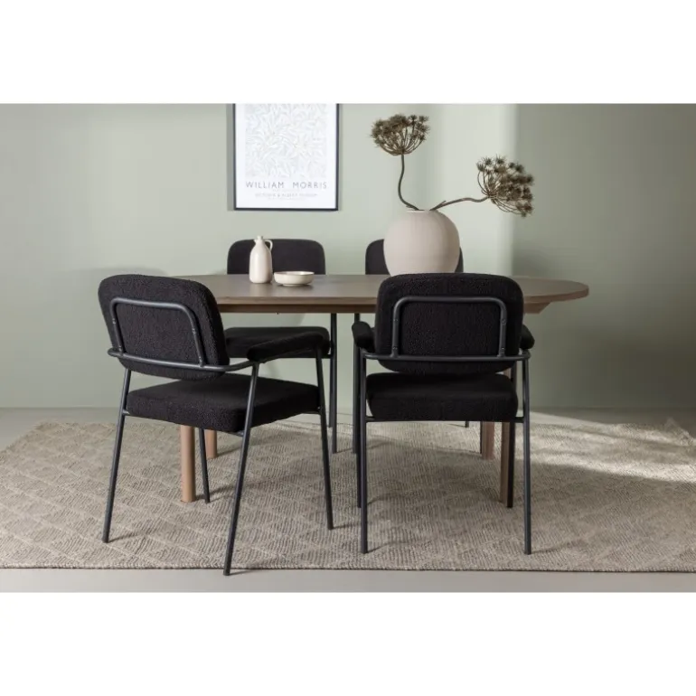 Kombinér tidløse farver med bløde materialer, indbydende former og minimalisme, og du får et Spisebordssæt i skandinavisk stil, der vil imponere både dig og dine gæster! Med vores ovale spisebord Andy får du den perfekte kombination af stil og funktionalitet. Det ovale bord er designet med et slankt og klassisk design, der vil forbedre indretningen i dit hjem. Med en tynd top i MDF i en varm, mørkebrun farve og fire klassiske cylinderformede ben udstråler Andy en følelse af raffineret enkelhed. Bordets dimensioner: 180×75 cm. Sammen med det runde spisebord tilbyder vi vores sorte spiseborde fra Yesterday-serien. Det fuldt polstrede sæde i sort bouclé stof tilbyder ikke kun et elegant og moderne look men også enestående komfort. Stolens slanke sorte metalben tilføjer et subtilt og stilfuldt præg. Derudover er de udstyret med integrerede armlæn for ekstra bekvemmelighed og afslapning. Dette indbydende Spisebordssæt vil uden tvivl imponere både dig og dine gæster. Her får du ikke kun et komplet Spisebordssæt til dit hjem, men også en oplevelse af luksus og kvalitet!