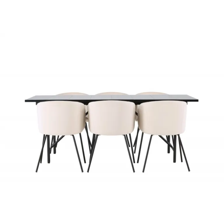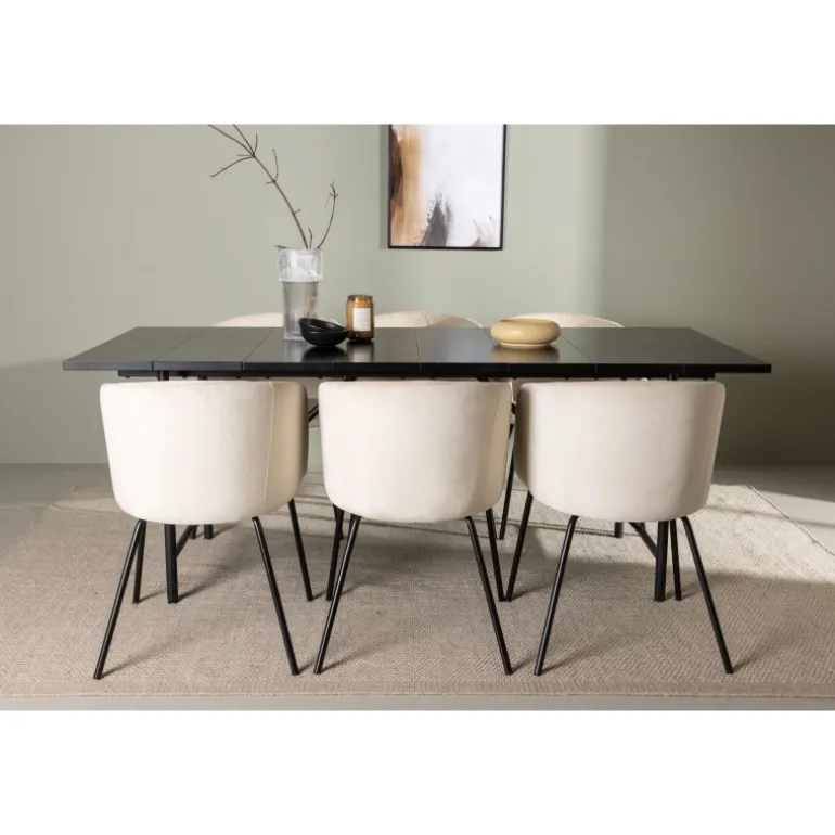 Et sort Spisebordssæt i skandinavisk design, der udstråler minimalisme, modebevidsthed, og modernitet! Dette smukke sorte spisebord, Astrid, vil være kronjuvelen i din indretning. Astrid spisebord imponerer med sin tynde bordplade i en elegant mat sort nuance. Lavet af MDF med finer, tilføjer det et sofistikeret touch til din spisestue. Basen er slank i sort metal, hvilket skaber en luftig atmosfære i rummet. Bordet måler 200×75 cm. For at komplementere dit spisebord, har vi også matchet det med sorte spisebordsstole fra Berit-serien. Disse stole har et slankt og moderne design med en let afrundet ryg og en komfortabel sædepolstring i velour og polyester-linned. Med deres slanke sorte jernben skaber de et sammenhængende helhedsindtryk sammen med bordets minimalistiske ramme. Dette Spisebordssæt er ikke kun en visuel perle, men tilbyder også et komfortabelt og funktionelt rum til middage og sociale sammenkomster. Skab en unik atmosfære i dit hjem og nyd hvert måltid i stil og komfort!