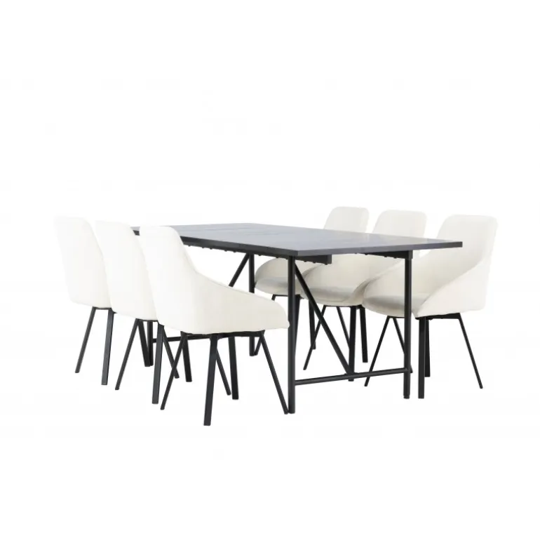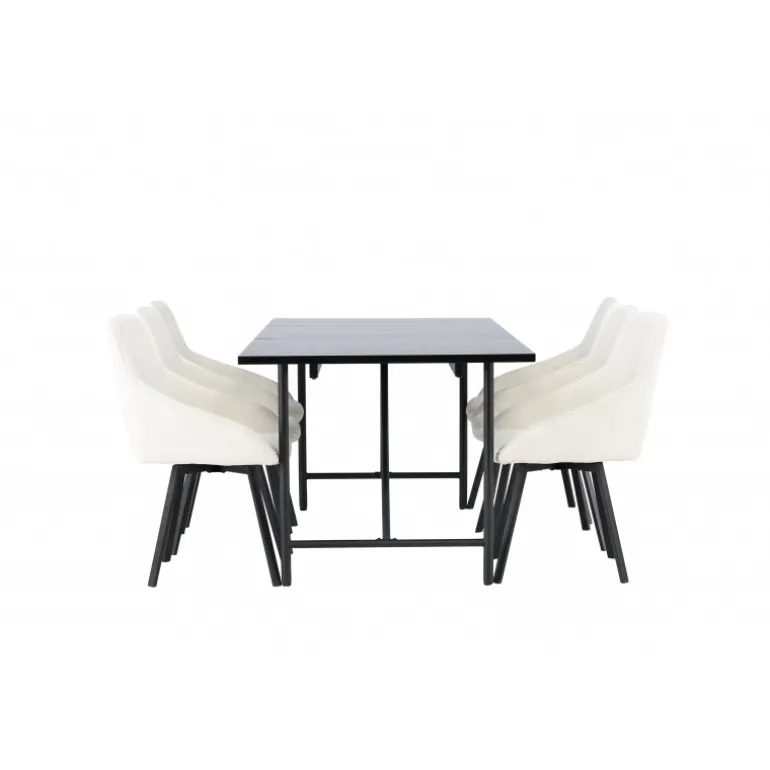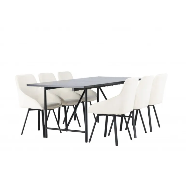 Et elegant spisebordssæt designet i overensstemmelse med de nyeste trends inden for farver og former! Vores sorte minimalistiske spisebord, Astrid, har en tynd, mat sort MDF-bordplade med finer, der tilføjer et sofistikeret touch til din indretningsstil. Den slanke og luftige design af basen skaber en åben atmosfære i rummet, hvilket gør det perfekt til at skabe en indbydende og stilfuld spiseplads. Derudover sikrer dens generøse størrelse, at alle har nok plads uden at føle sig trange. Bordets dimensioner er 200×75 cm. Sammen med de beige stole fra Rosie-serien bliver dette spisebordssæt komplet. Disse skandinaviske designstole er både trendy og komfortable. Den fuldt polstrede beige stofsæde og de sorte, elegante metalben med let flarede former tilføjer et moderne touch til din indretning. Med de integrerede armlæn kan du nyde et afslappet måltid, mens du opretholder en elegant stil. Lad Astrid-spisebordet og Rosie-stolene tage din spiseoplevelse til et nyt niveau af stil og komfort. Skab et sted, hvor familie og venner kan samles for at nyde god mad og skabe minder sammen!